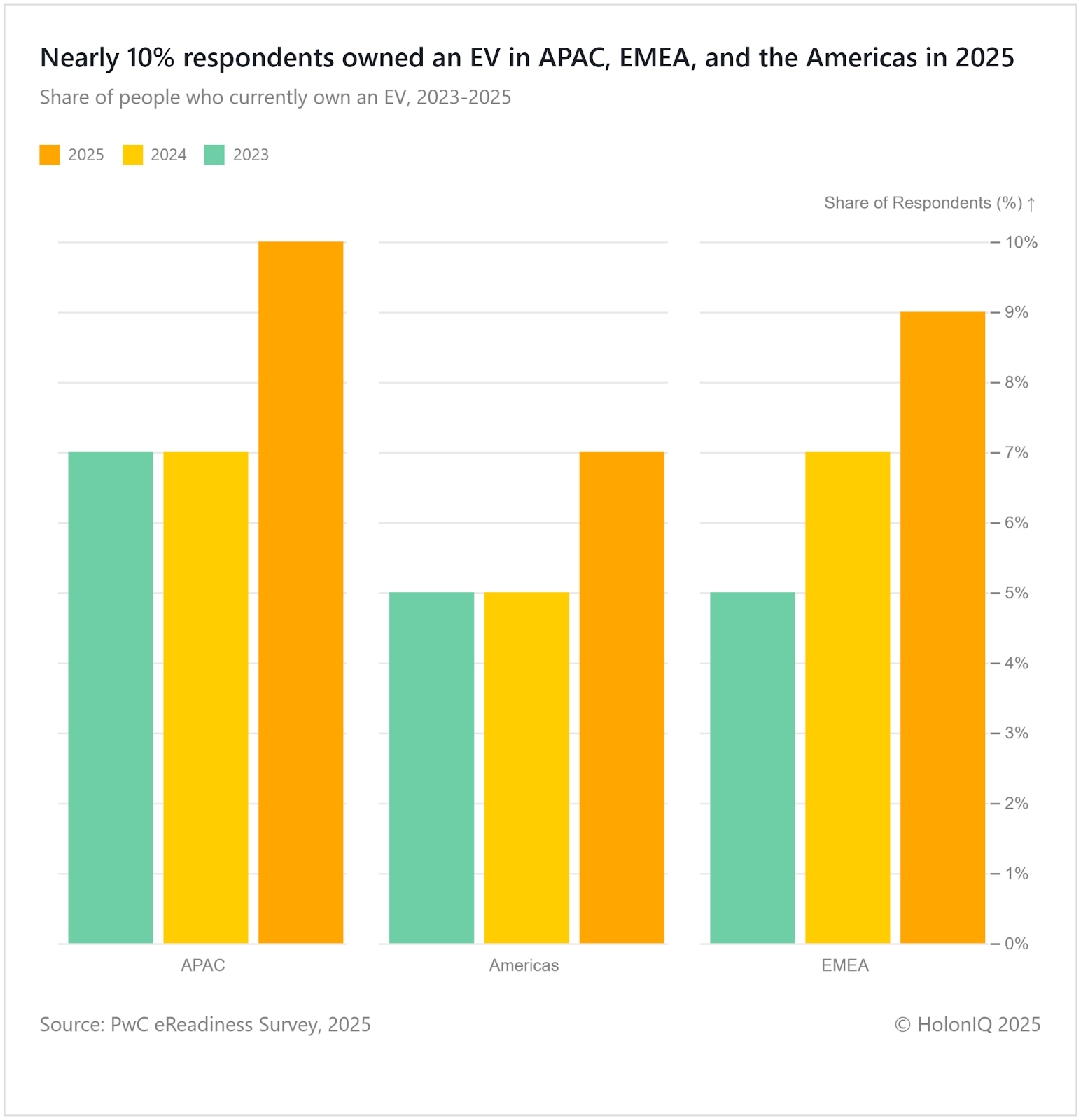 Nearly 10% owned an EV in APAC by 2025, with the region capturing 67.3% of global EV sales. APAC's dominance stems from Chinese EVs revolutionising affordability as EV prices even undercut gasoline-powered cars. Chinese brands captured 75% of emerging market EV sales growth in 2024, driven by battery costs below $115/kWh, government subsidies, and local manufacturing. Adding to this momentum, BYD's Indonesia factory will produce 150,000 units annually. Widespread accessibility stems from China's 12.8M charging points and aggressive regional expansion, making Chinese EVs the default choice for price-sensitive consumers across Southeast Asia.
