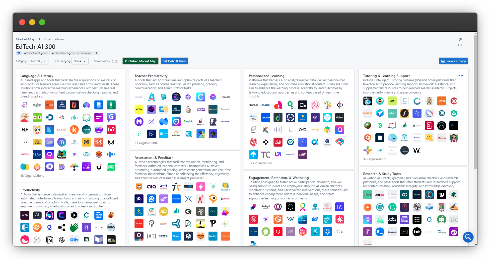 HolonIQ research has compiled a comprehensive market map of over 300 AI solutions in education categorized across a broad spectrum of applications. If youโre a HolonIQ customer, explore this interactive map on our platform. If not, sign up for a demo to learn more.