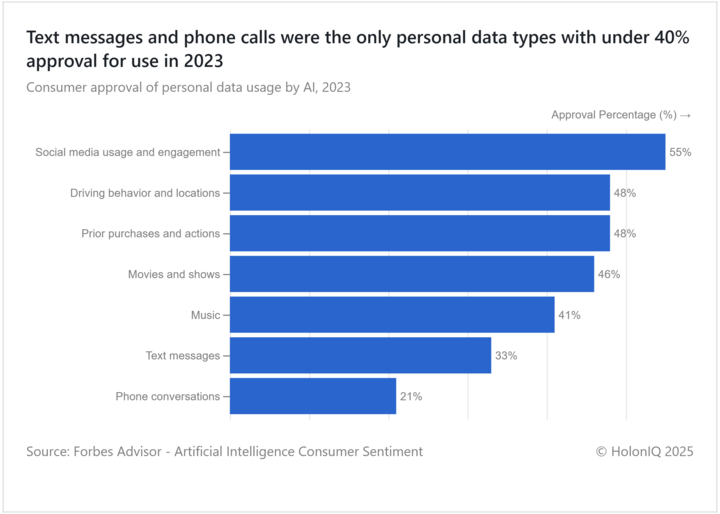 Consumer approval for AI data usage peaks at 55% for social media, while only 21% approve for phone conversation analysis. This highlights consumer caution regarding AI's access to private versus public data. While AI uses data to personalize services and learn while delivering enhanced results, this trend intensifies privacy concerns, especially with generative AI risks. In response, regulatory frameworks like the EU AI Act are emerging to govern AI data usage and protect consumer privacy, despite the challenge of regulating constantly evolving technology.