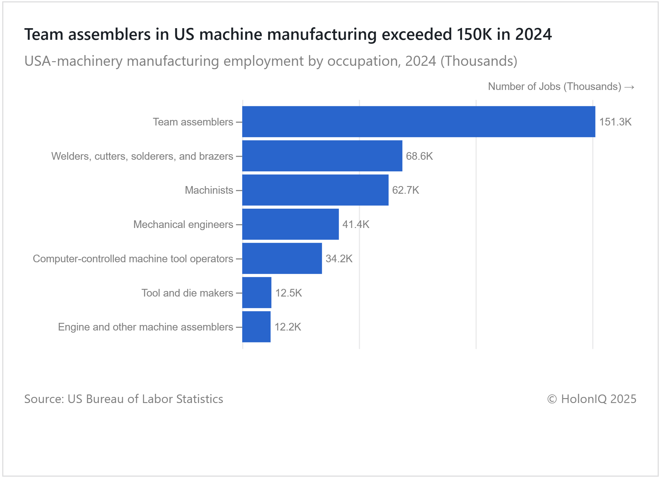 In 2024, US machinery manufacturing employed 151,310 team assemblers and 68,630 welders, reflecting strong demand for skilled labor and assembly roles. To address workforce challenges, the government’s National Strategy for Advanced Manufacturing focuses on expanding talent pools and enhancing training programs. Initiatives like Manufacturing USA’s Workforce Development Roadmap aim to equip workers with advanced skills, while the FAME USA program supports workforce revitalization, ensuring sector competitiveness.