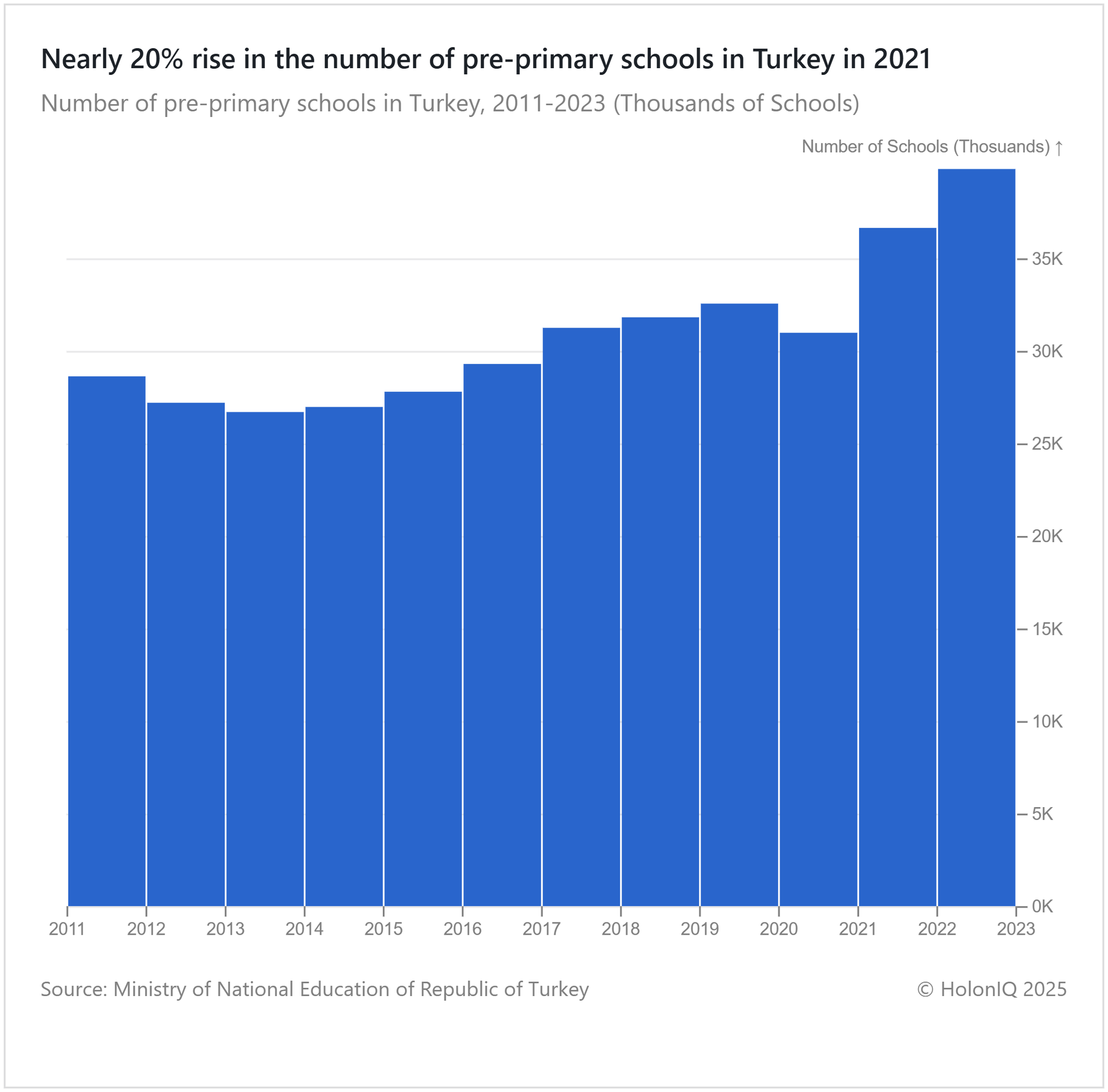 The number of pre-primary schools in Turkey fluctuated from 30K in 2011 to 40K in 2022. The government transformed village schools into Village Life Centers to provide ECE in low-population areas and increase financial support. Launched in 2022, the Early Childhood Education Campaign aimed to triple kindergarten capacity within a year. These initiatives underscore Turkey's commitment to universalize ECE and reduce educational inequalities, with ambitious enrollment targets for 2023.