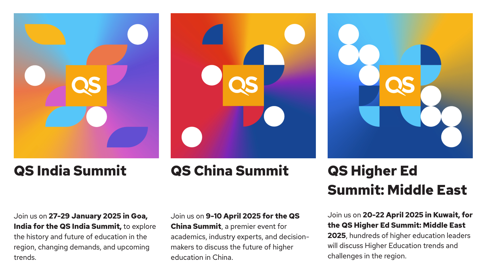 2025 events include the QS EduData Summit and QS Reimagine Education, and regional and country-focused events for Asia-Pacific, Middle East, Africa, Americas, Europe, China, India and Arab region. Learn More.