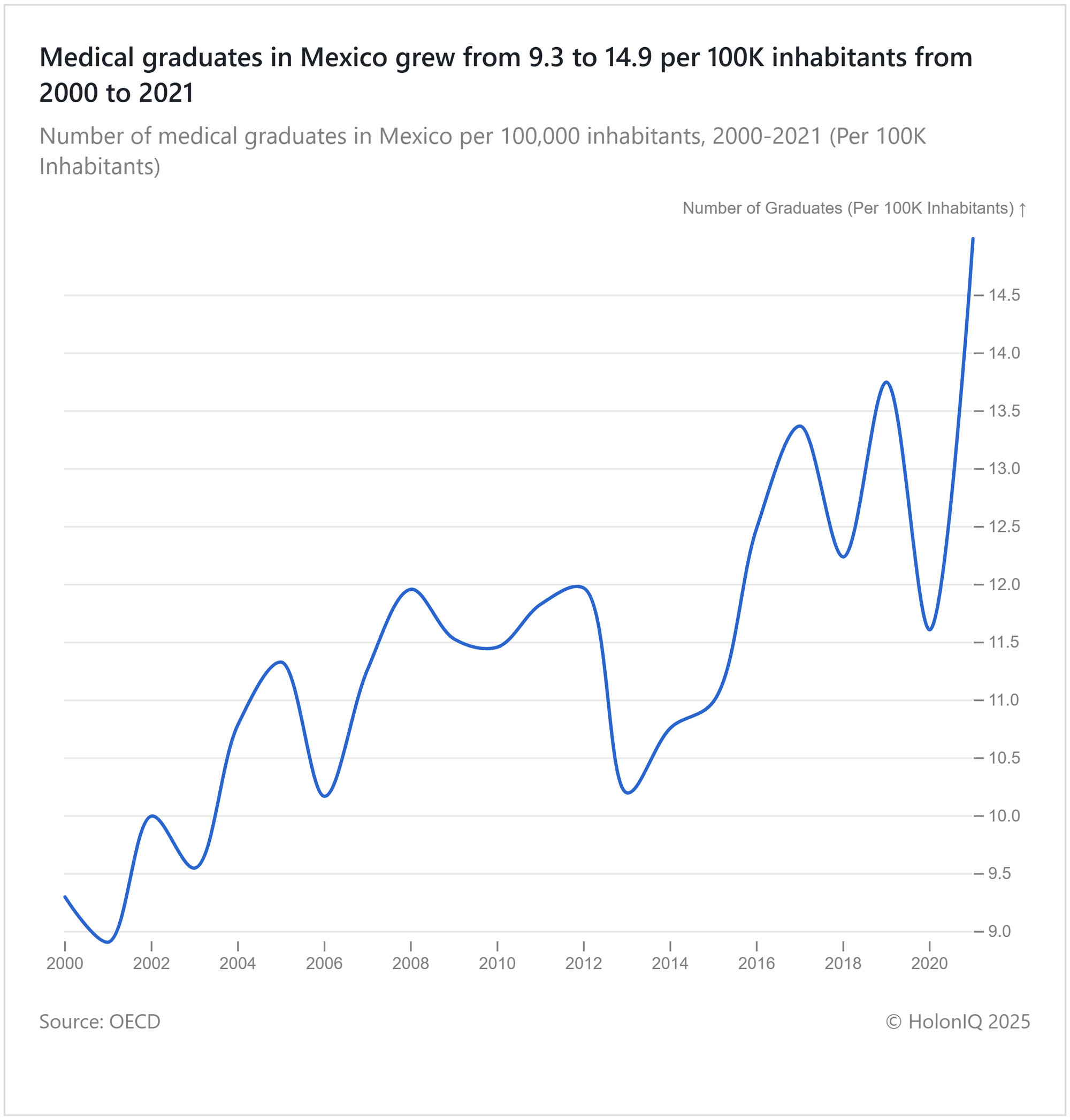 Mexico's medical graduates rose from 9.3 to nearly 15 per 100,000 inhabitants between 2000 and 2021, reflecting a growing focus on healthcare education. Successors to the government initiative Seguro Popular, INSABI, and IMSS Bienestar, aim to provide comprehensive healthcare coverage and address workforce shortages. These initiatives are part of broader healthcare reform efforts to enhance access and equity in healthcare services.