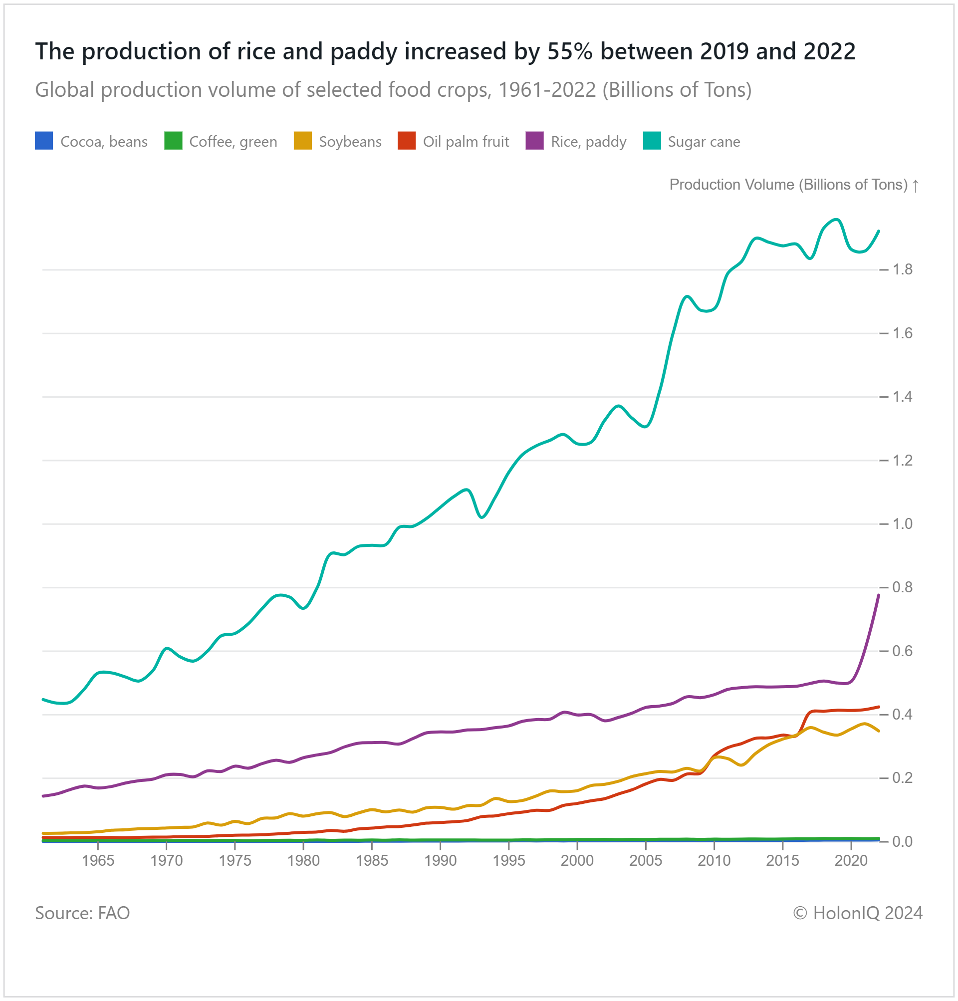 Currently, sugar cane is the top food crop by production volume, with nearly 2 billion tons produced. Rice and paddy come next, with around 800 million tons produced in 2022. Notably, rice and paddy have experienced a significant growth in production, with a 55% increase from 2019 to 2022. This rise highlights the growing importance and efficiency of rice and paddy cultivation in recent years.