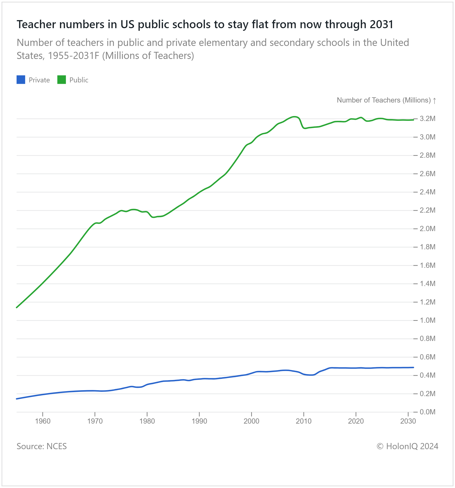 From 1955 to 2009, the number of teachers in the US nearly tripled, with private school teachers experiencing similar growth. However, since then, the growth has slowed, and teacher numbers are expected to remain largely flat from now until 2031. Meanwhile, the student population is projected to decrease by 5%, lowering the pupil-to-teacher ratio from 12 to 10.