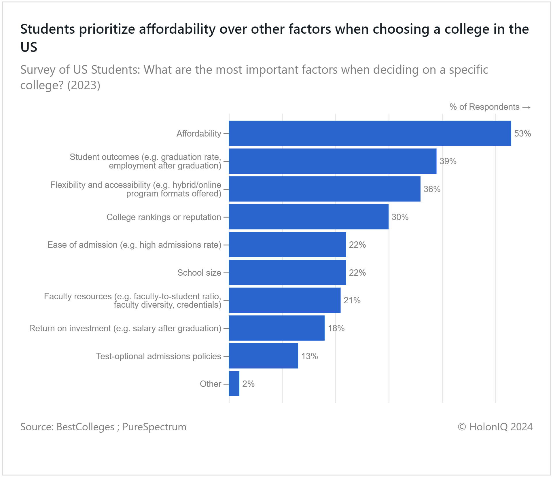 When choosing a college in the United States, the most important factors for prospective students are affordability (53%), student outcomes (39%), and flexibility/accessibility (36%). Interestingly, ROI and test-optional admission policies were less important. This demonstrates the variation in student priorities when choosing a college.