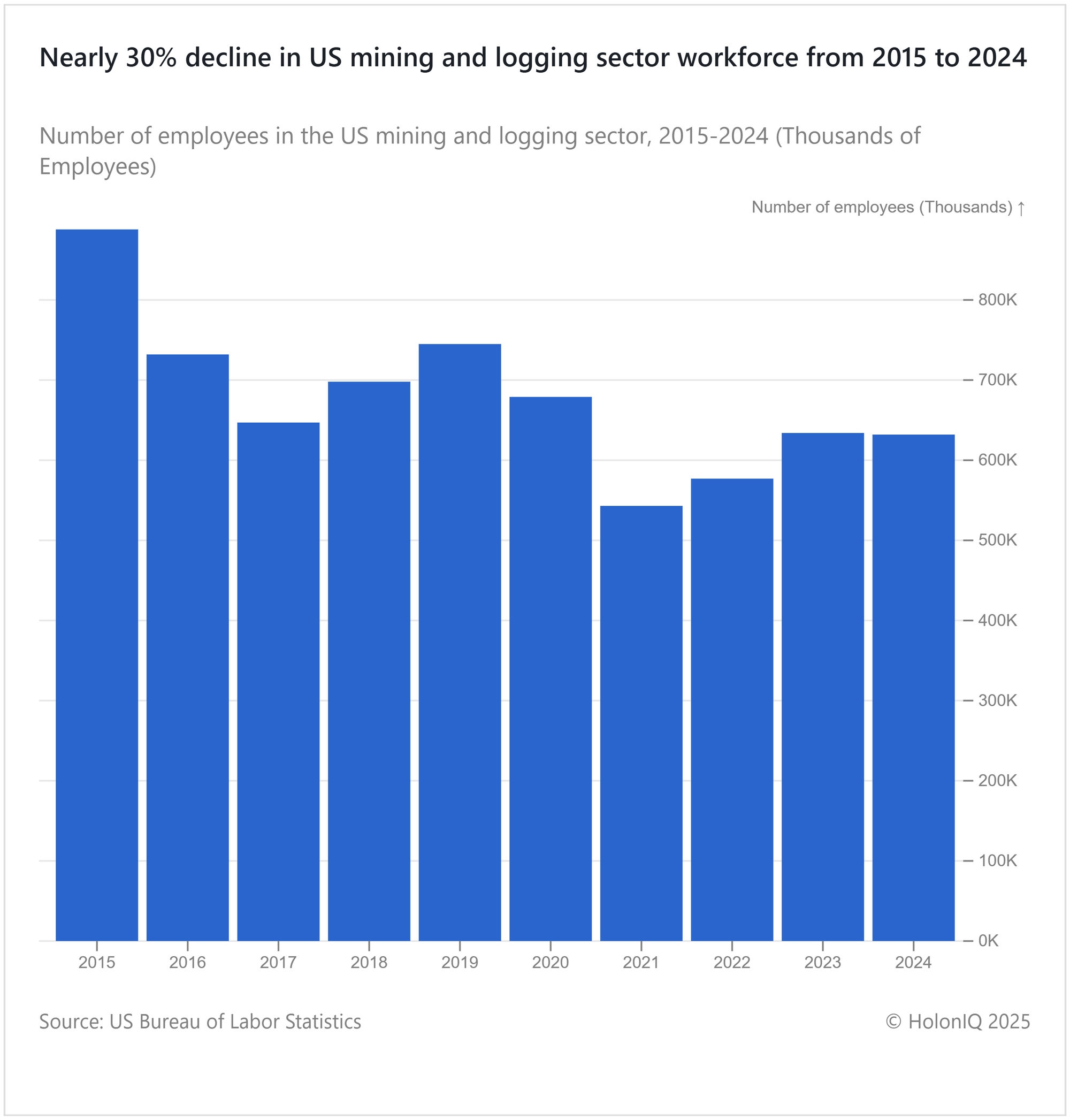 In January 2024, the US mining and logging sector employed 632K workers, slightly down from 2023 but up 16% from the pandemic low of 543K in 2021. Despite this recovery, employment remains well below the 2015 peak of 888K, due to automation and demand changes. The Infrastructure Investment and Jobs Act invests in domestic mining infrastructure to support the sector, while the Energy Communities Interagency Working Group provides grants and retraining to help displaced workers. These policies promote sustainable growth and a just transition for affected communities.