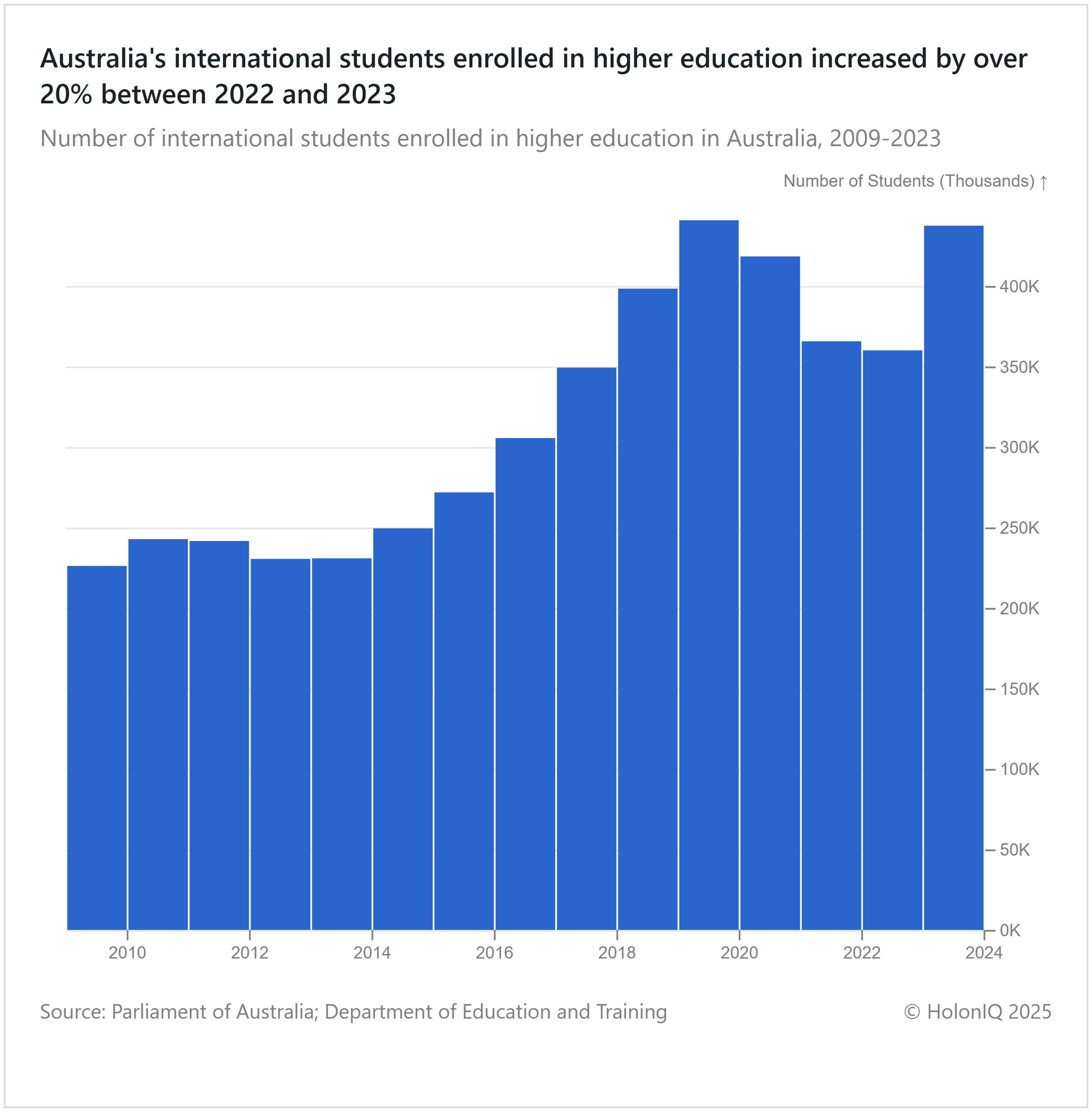 Between 2022 and 2023, Australia's international student enrollments in higher education increased by over 20%, from 361K in 2022 to over 436K in 2023. This growth highlights Australia's appeal as a global education hub, supported by eased visa policies and border reopenings post-pandemic. The increase has sparked discussions about capacity and infrastructure challenges.