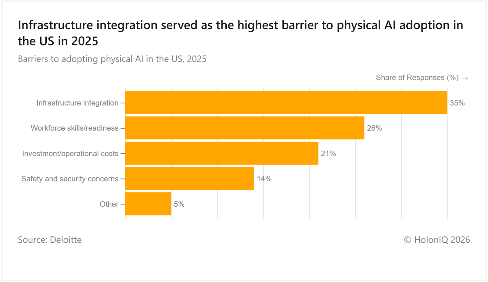 Infrastructure integration remains the top barrier to adopting physical AI in the US. Many factories and facilities rely on legacy machinery and fragmented IT systems that were not designed for real time data exchange. Upgrading sensors, networks, and control systems requires significant investment and operational downtime, creating delays in implementation. Addressing these integration challenges is crucial for scaling AI adoption and unlocking the full potential of automation across various industries.