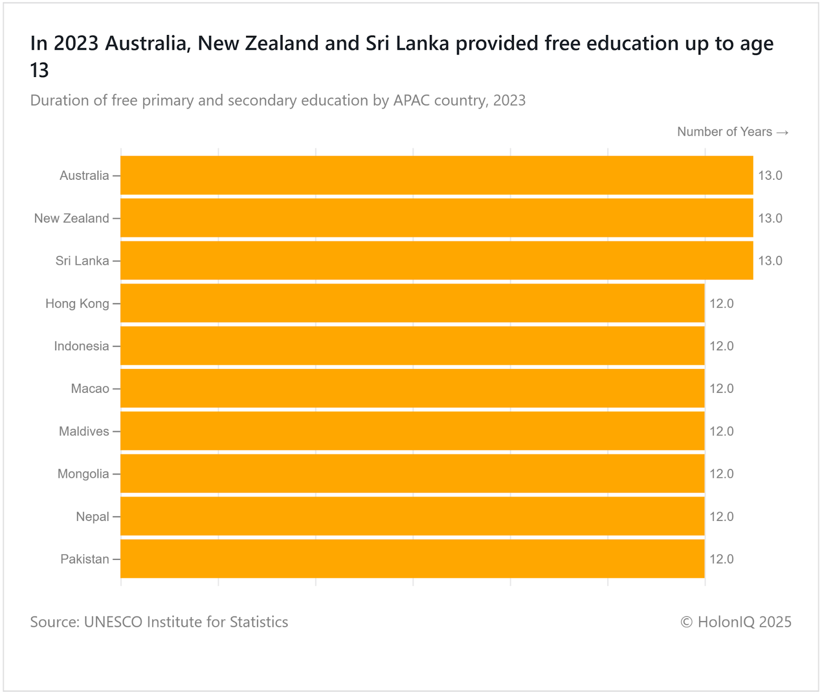 Sri Lanka, Australia, and New Zealand lead the APAC region with 13 years of free primary and secondary education, while several others, including Indonesia, Nepal, and Hong Kong, provide 12 years. This long term access strengthens pathways to higher education and equips students with essential skills for future economies. Expanding free schooling is also linked to greater social mobility and workforce readiness. UNESCO continues to support such initiatives under SDG 4: Quality Education, promoting lifelong learning opportunities globally.