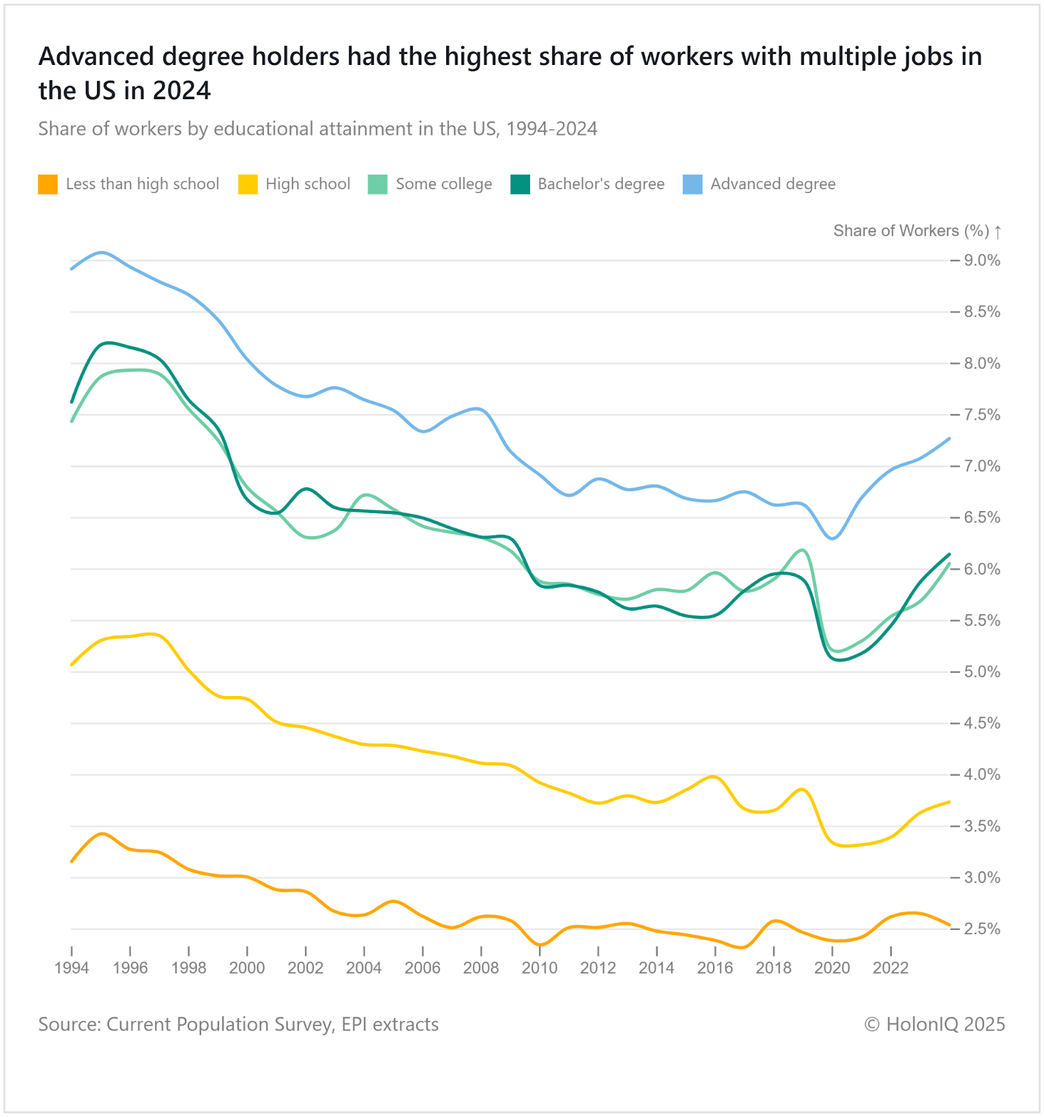 By 2024, advanced degree holders in the US had the highest share of multiple-job employment, surpassing those with bachelor’s degrees and far above less-educated groups, reversing the common expectation that lower-skilled workers hold multiple jobs. This reflects that highly educated professionals increasingly pursue multiple high-paying roles, consulting, and portfolio careers, leveraging skills and networks. It underscores the value of formal tertiary education for access to diverse, knowledge-intensive opportunities and income streams in a flexible labour market.