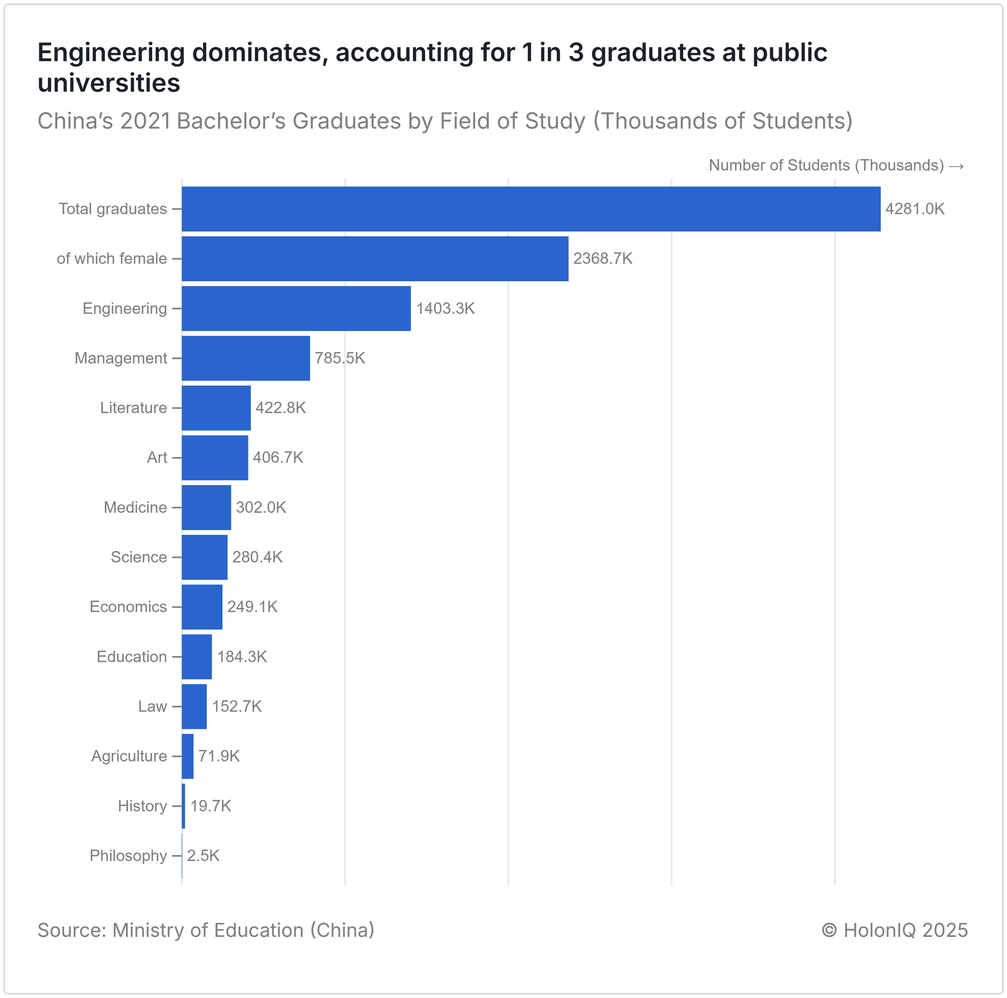 ⚙️ Engineering leads with 1,403,000 graduates out of 4,280,000, reflecting China’s strategic focus on technical skills to drive industrial development.