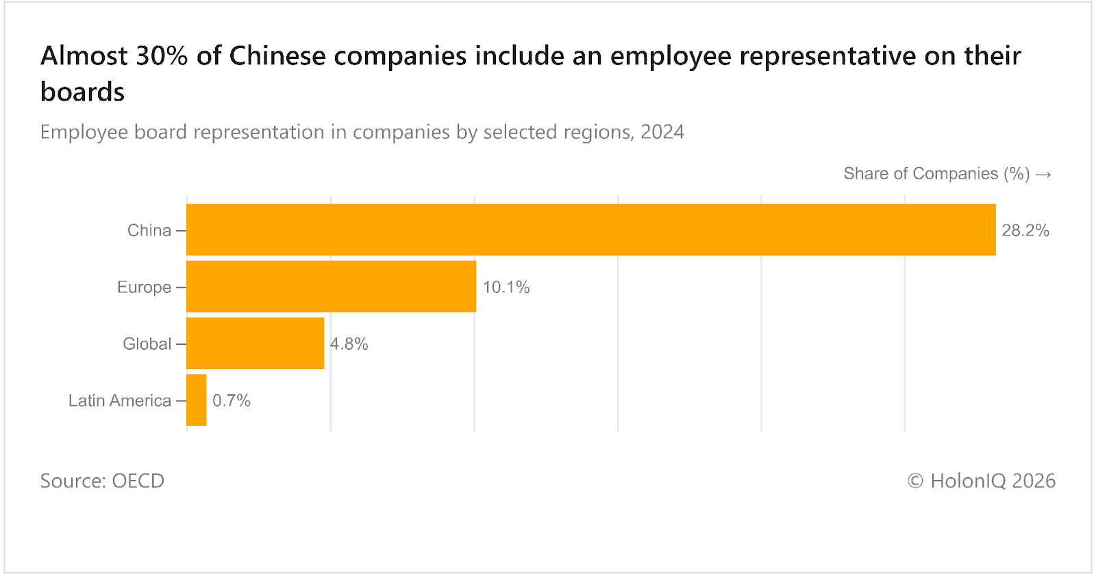 Employee board representation in China was over 20 percentage points higher than the global average. This shows significant regional variation in worker participation in corporate governance. Employee board representation means workers hold seats on company boards, influencing strategic decisions. China’s higher share reflects state ownership structures and mandatory worker director requirements in many firms. Under recent policy changes in China, private companies with more than 300 employees are required to have employee representatives on their boards.