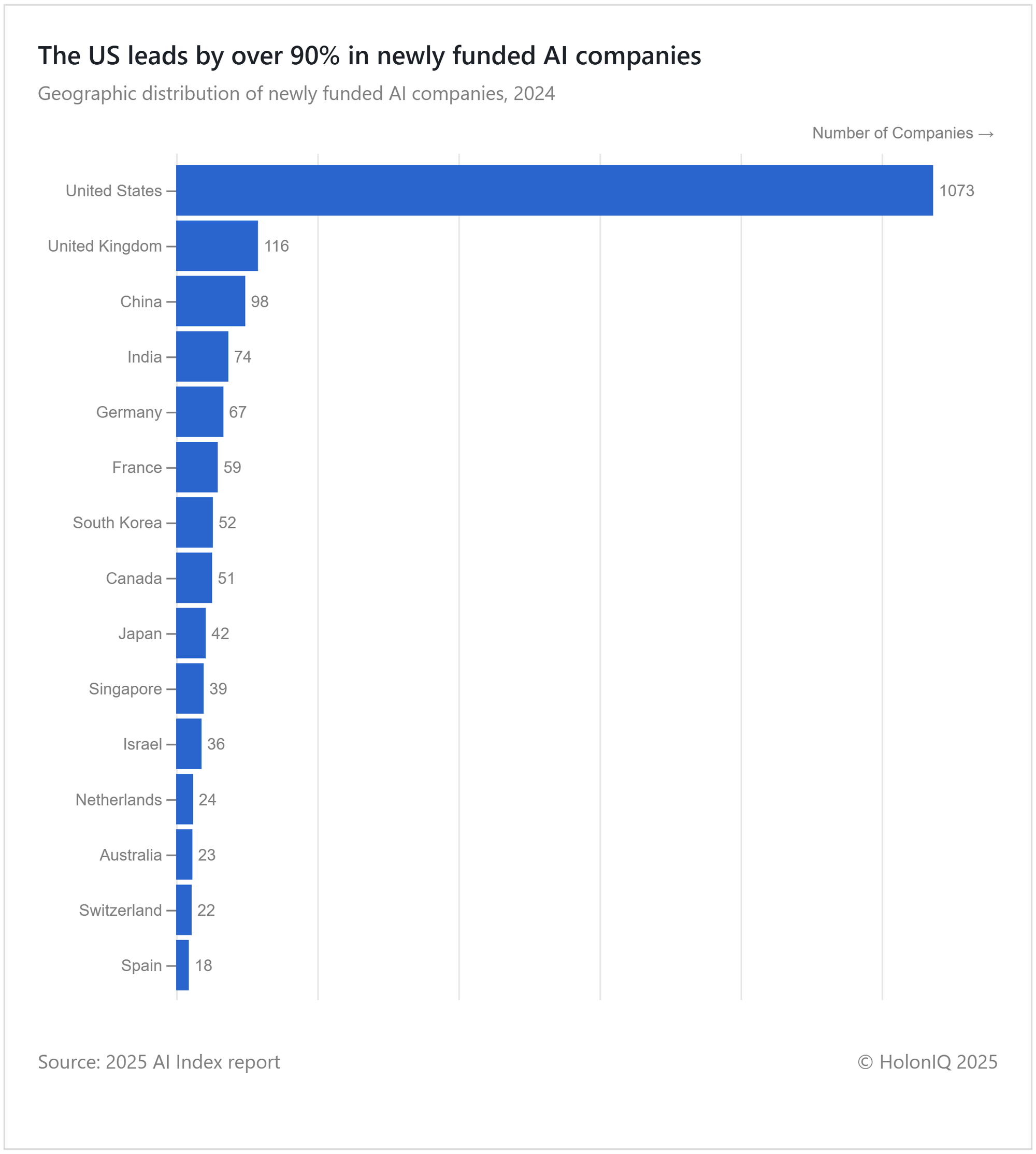 📈 The US led globally with over 1000 newly funded AI companies, significantly more than the second-highest, the United Kingdom, with 116 companies.