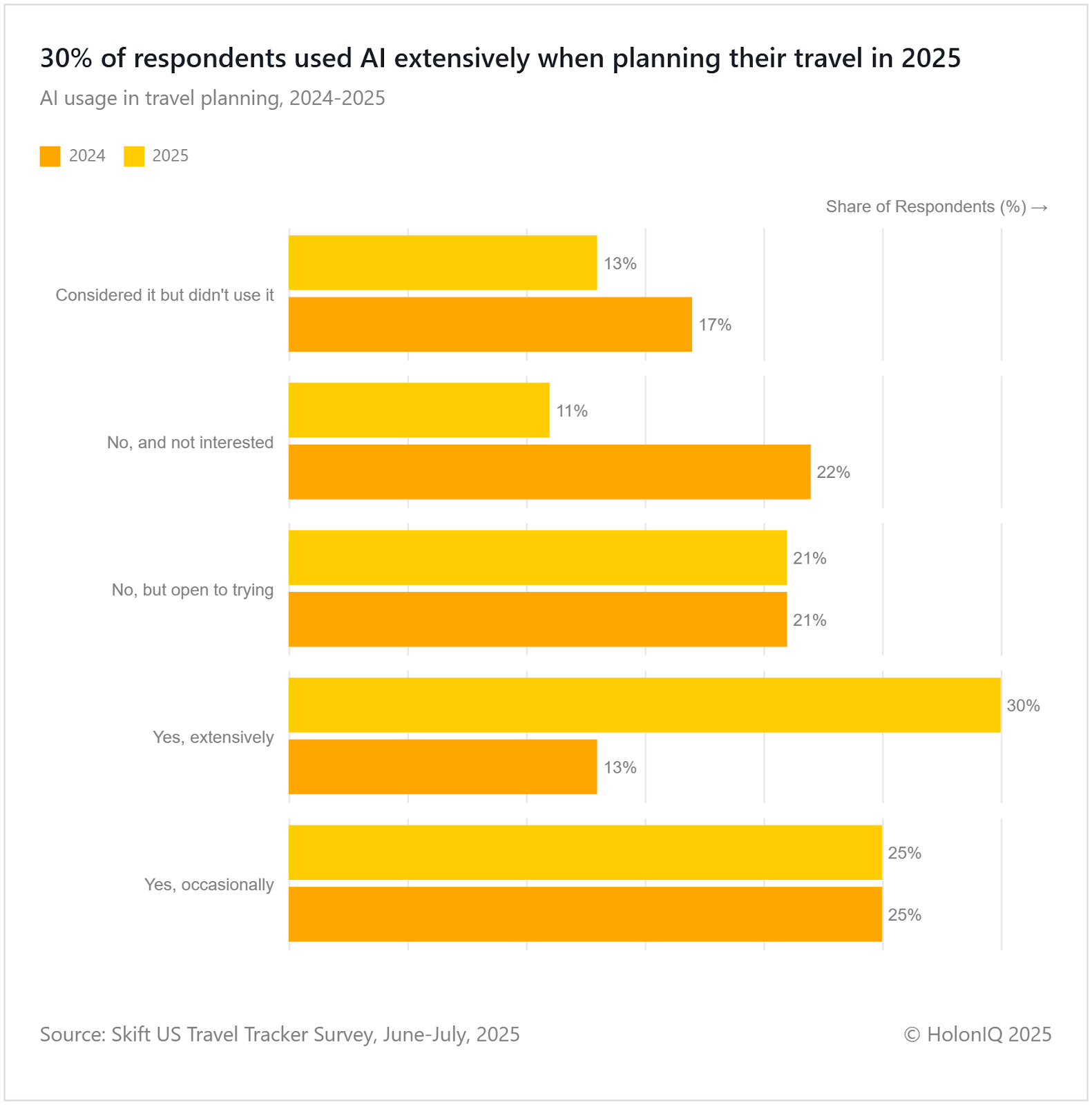 AI adoption in travel planning increased between 2024 and 2025, with extensive usage increasing from 13% to 30% of respondents, while 25% now use AI occasionally, signaling strong latent demand. This doubling reflects growing consumer comfort with AI-powered travel tools amid the technology's mainstream breakthrough. The shift parallels the tourism industry's broader digital transformation, as platforms increasingly integrate generative AI and agentic AI for itinerary creation and personalised recommendations. This mirrors Google's 2024 launch of AI-powered travel planning features in Search, bringing generative itinerary tools directly to mainstream consumers.