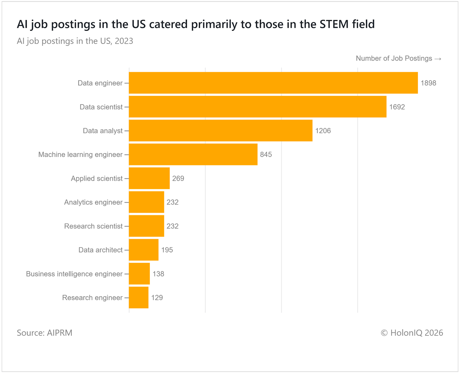 In 2023, AI job postings in the United States strongly favoured STEM roles, with data engineers, data scientists, and analysts leading demand. These positions highlight the tech sector’s reliance on advanced analytics and machine learning to drive innovation. The distribution also reflects the increasing need for skilled professionals who can develop, deploy, and maintain AI systems across industries, underlining how AI continues to reshape the US workforce toward technical expertise.