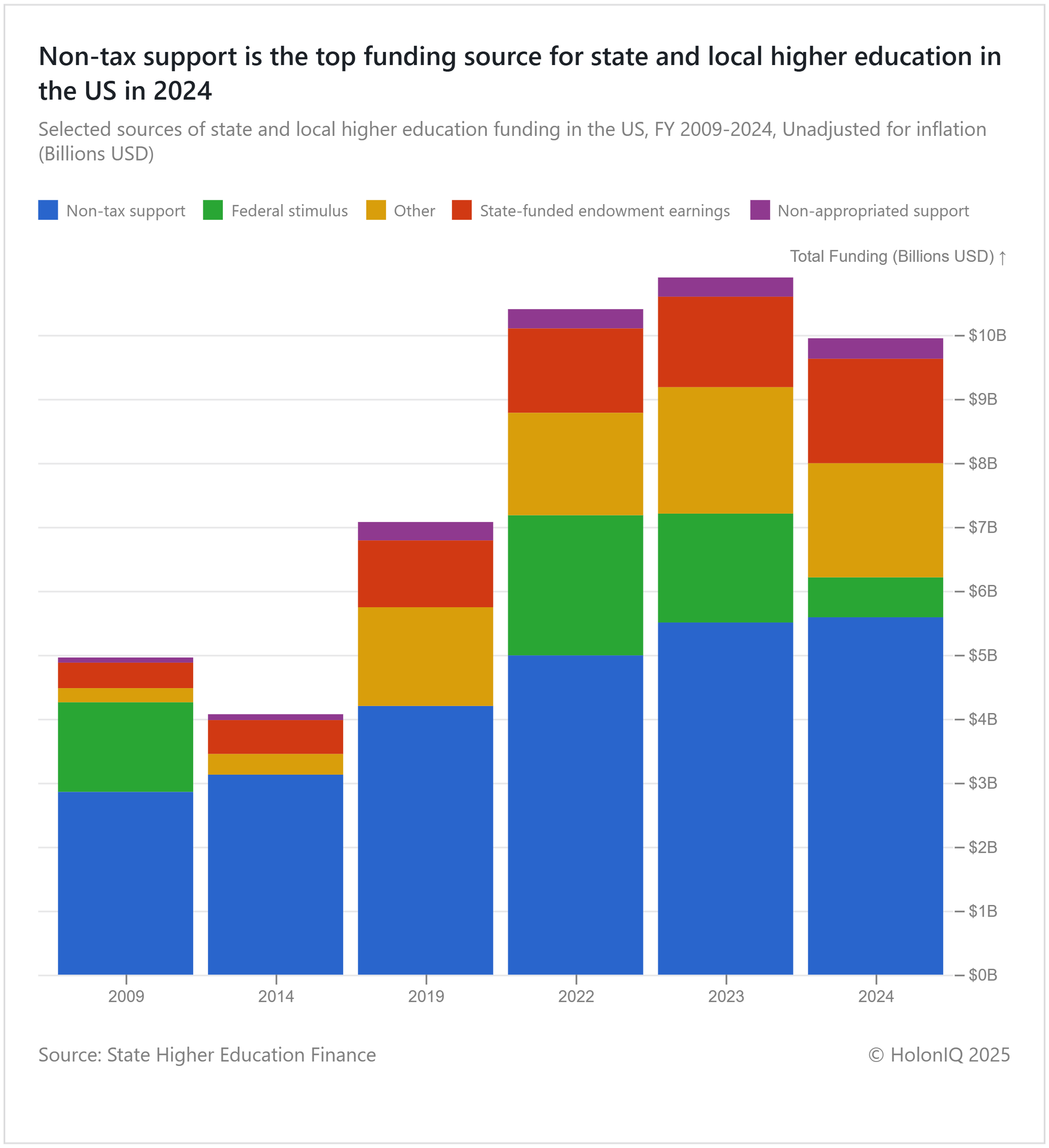 Funding for state and local higher education had its highest increase in 2023, with over 10B USD. Despite a decrease in funding, non- tax support has continued to increase by over 2.5B, becoming the largest single revenue source for many institutions. The decline seen in 2024 is largely due to declining enrolment, high tuition costs, and doubts concerning the value of a degree. Future challenges for state and local education funding in the USA will involve government policy navigating fiscal constraints and evolving student needs.