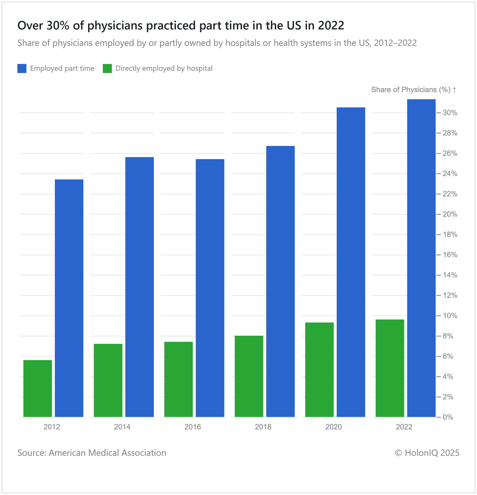 Physicians practicing part time in the US have increased to over 30% by 2022, whereas those employed directly by hospitals have remained under 10%. This increase is due to physicians moving away from private practices and shifting towards employment within larger health care systems. Physicians state that this is due to the access of costly resources and the necessity of managing payers' administrative and regulatory obligations more effectively. The state of California’s ban on physician employment by hospitals is based on the conflict of moral obligation and professional standards.