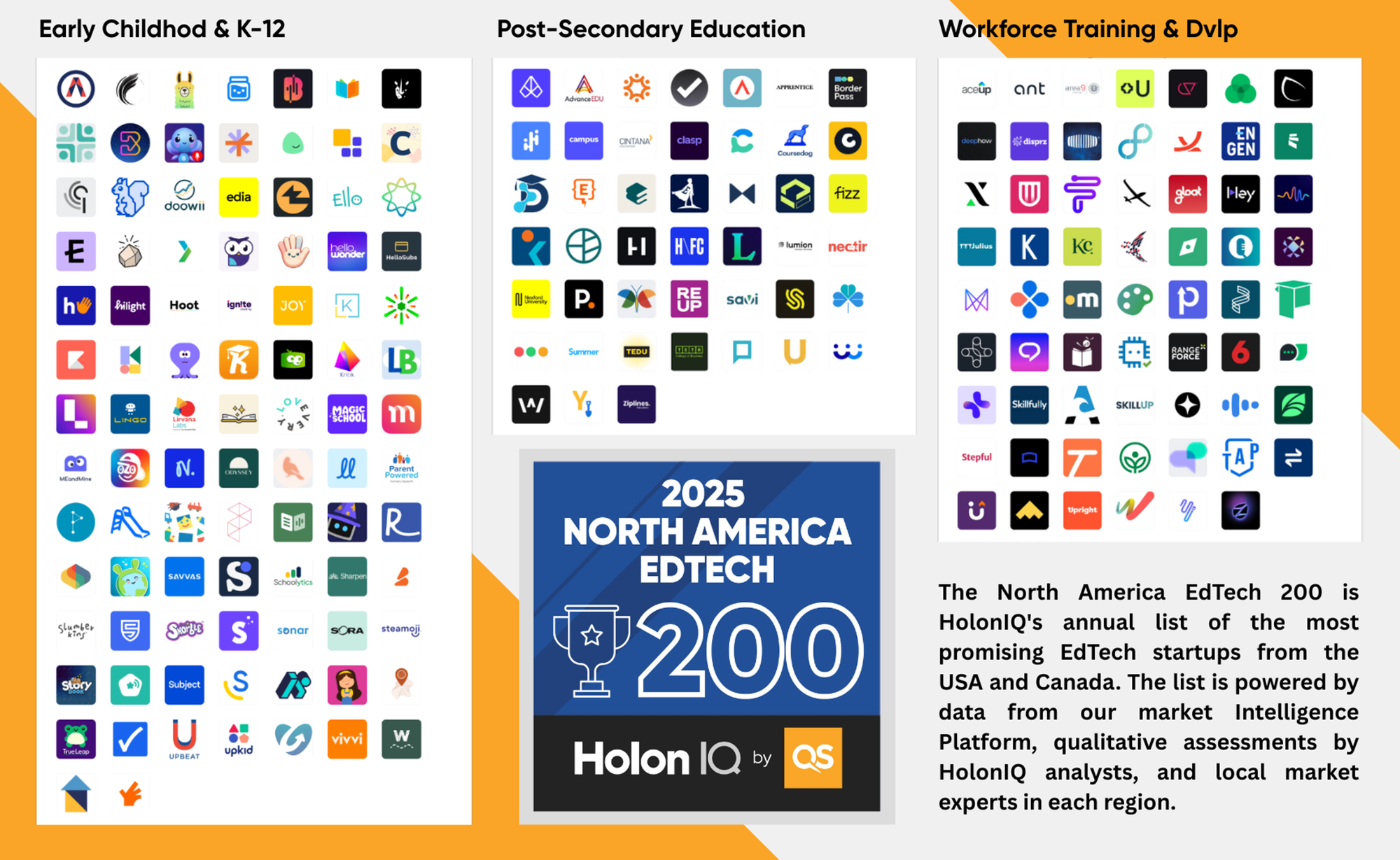 AI-powered tools are no longer just gaining tractionโtheyโre becoming embedded into the foundation of education, from classroom workflows to career navigation. Startups like Magic School AI and Brisk Teaching secured major funding to streamline educator workloads, while Skillup and PrakitaAI are accelerating career-connected learning. The 2025 North America EdTech 200 highlights the most promising startups driving these shifts, with a sharper focus on business models that can withstand todayโs funding realities. Learn more about the makeup of the 2025 North America EdTech 200, and download the market map. Customers can deep dive the data on the HolonIQ platform. Click here to request a demo.