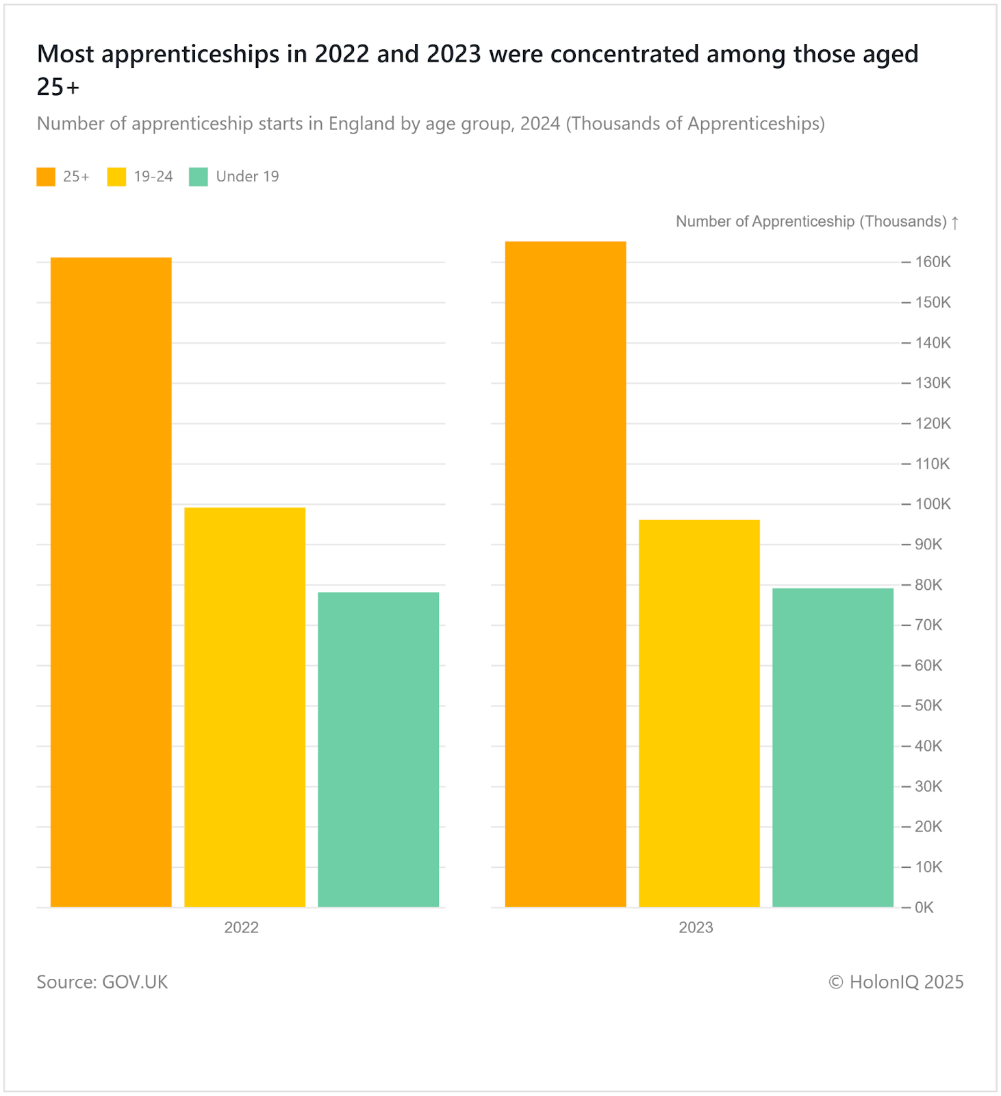 UK apprenticeship starts grew from 338,000 in 2022 to 340,000 in 2023, driven entirely by the 25+ age group's increasing enrollment. To redirect investment towards younger workers, the government is cutting Level 7 (Master 's-equivalent) funding for those aged 22 and over starting January 2026. This focus on youth and a simultaneous cut of red tape over Maths and English requirements for adult learners over 19 are expected to create up to 10,000 more apprenticeships per year.