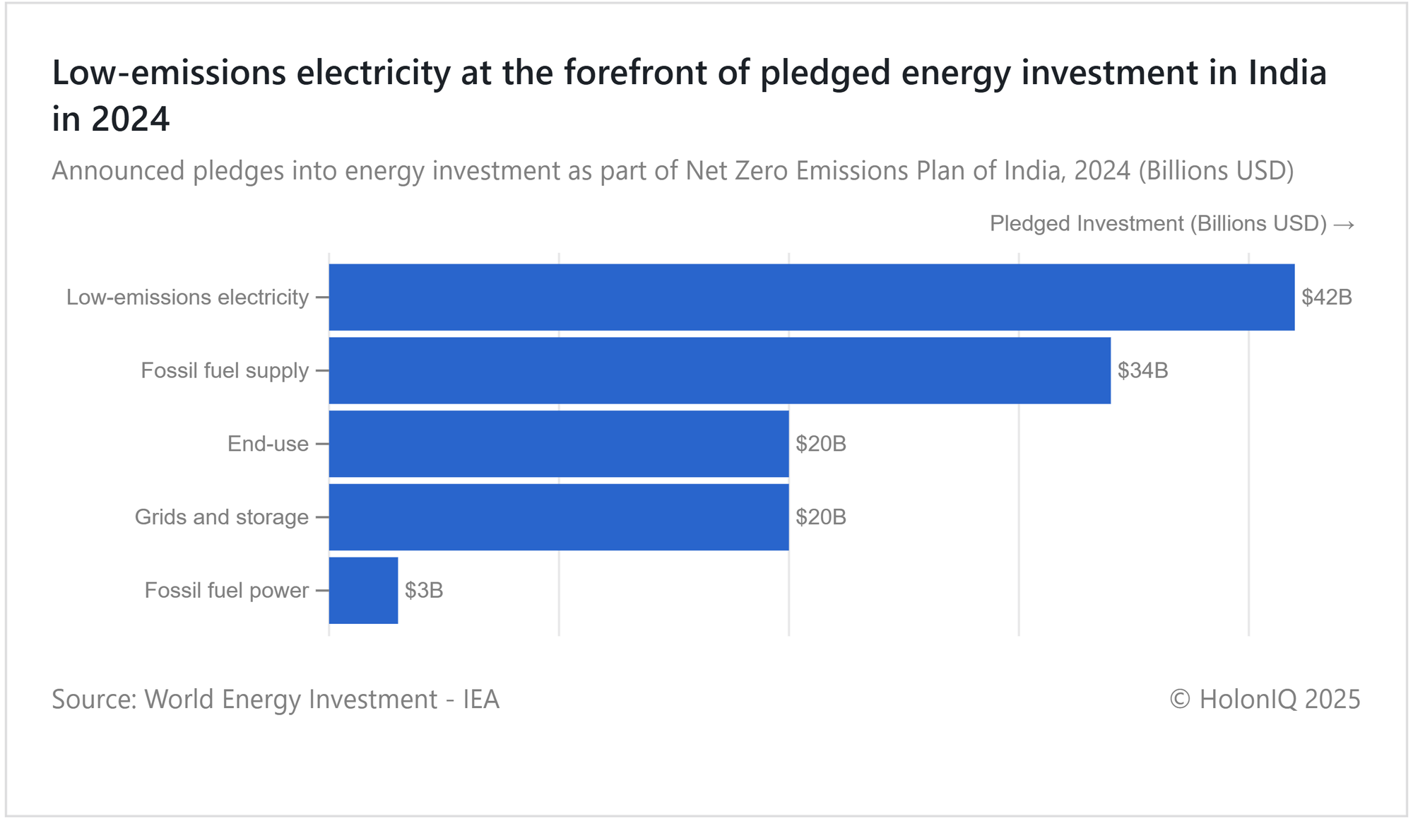 India's energy investment pledges heavily favor low-emissions electricity, which commands a 42% share, far surpassing fossil fuel power. This trend underscores a decisive national shift towards green energy infrastructure, aligning with increased government and private investment in the sector, such as $3 billion in clean energy projects for green ammonia production. These efforts are cornerstones of the national strategy, guided by India's Net Zero Emissions Plan and promoted by the Invest India initiative incentivizing private investment.