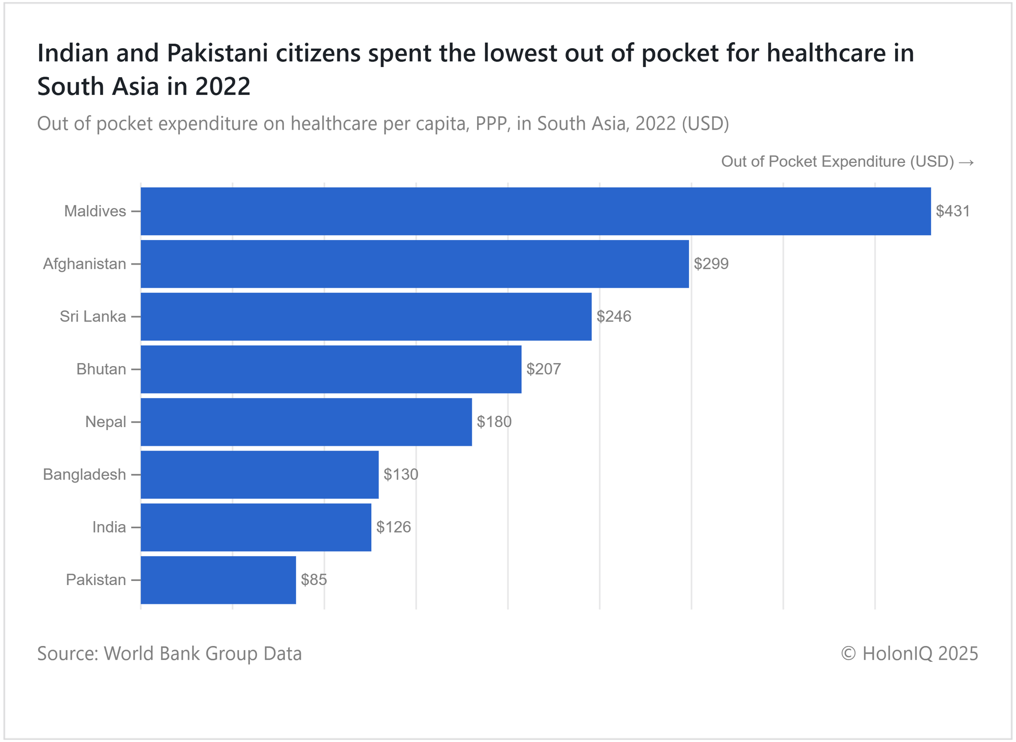 ⚕️Healthcare. India and Pakistan are the lowest in out-of-pocket healthcare spending in South Asia