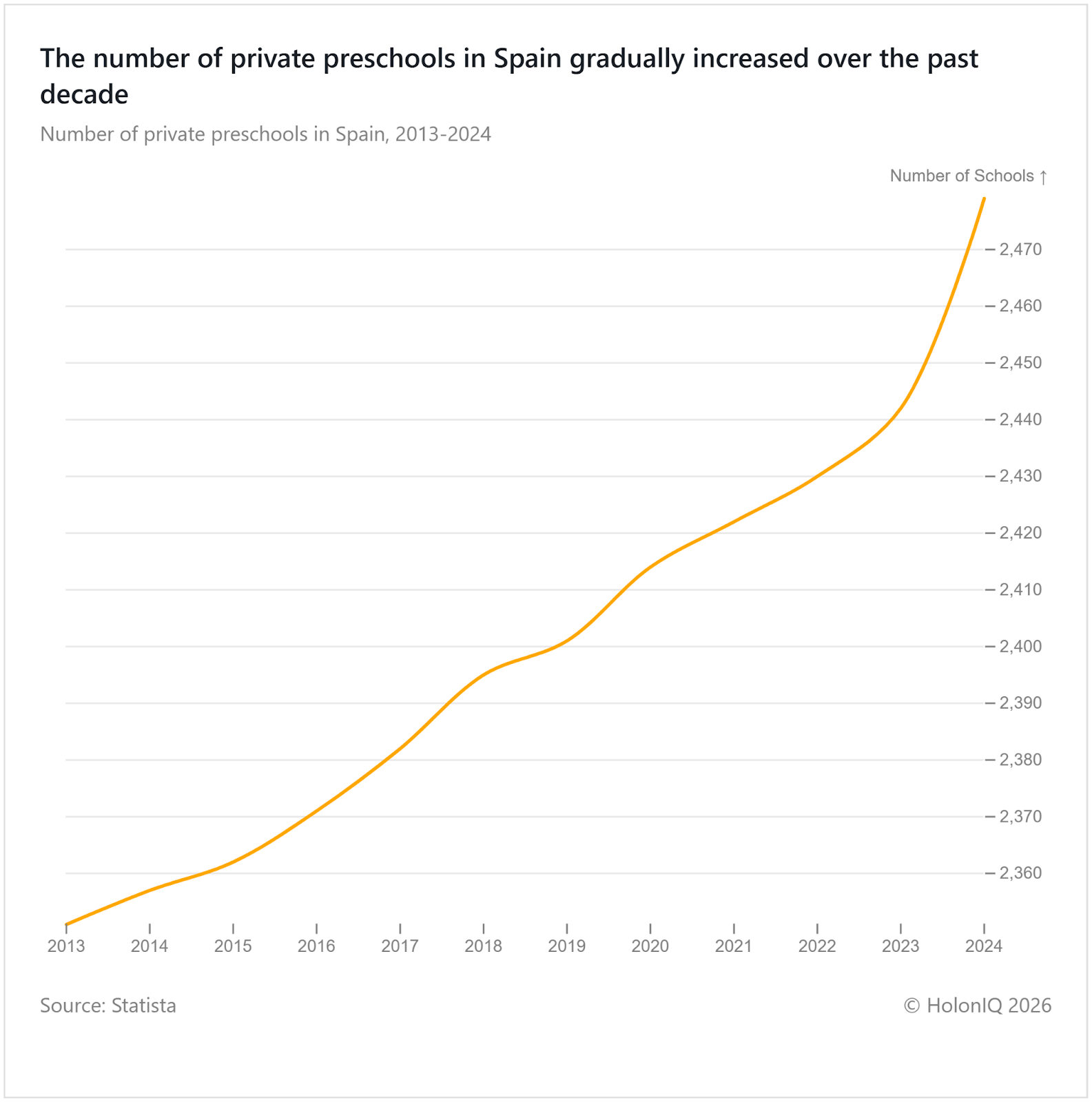 The modest increase in private preschools in Spain from 2023 to 2024 reflects a maturing early childhood education market rather than declining demand. Tighter regulatory requirements, higher operating costs, and workforce shortages have slowed new school openings. At the same time, population growth among preschool age children has stabilised in many regions, reducing pressure for rapid expansion. Global public investment in subsidised and public preschool places has also eased reliance on private providers.