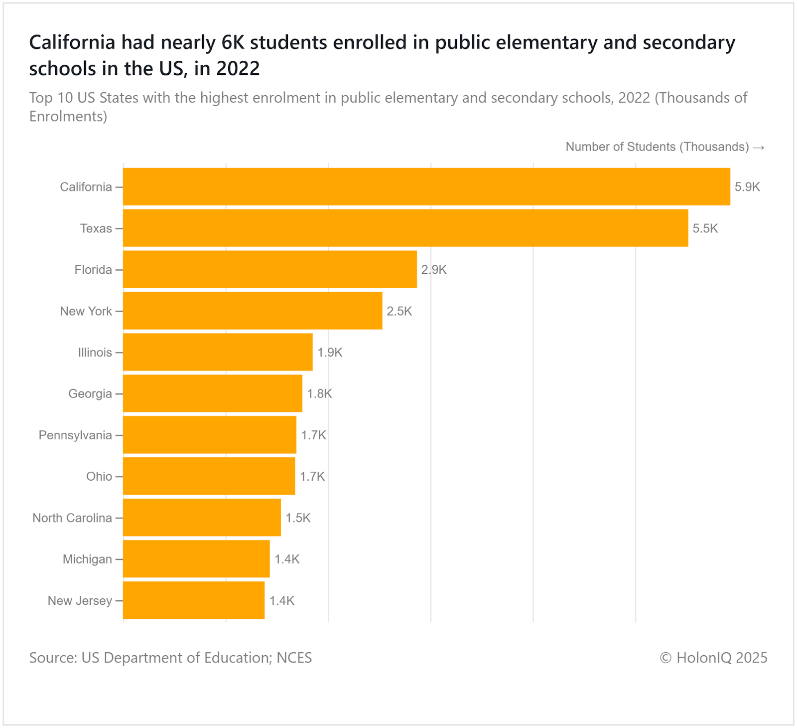 California and Texas led US public school enrolment in 2022, with 5.9K and 5.5K students respectively, far ahead of other states. Florida and New York followed, each with more than 2.5K enrolled. This concentration reflects both population size and migration trends, with southern states seeing rising enrollments. The US Department of Education continues to guide resource allocation through Title I programs supporting equitable access in high-need school districts.