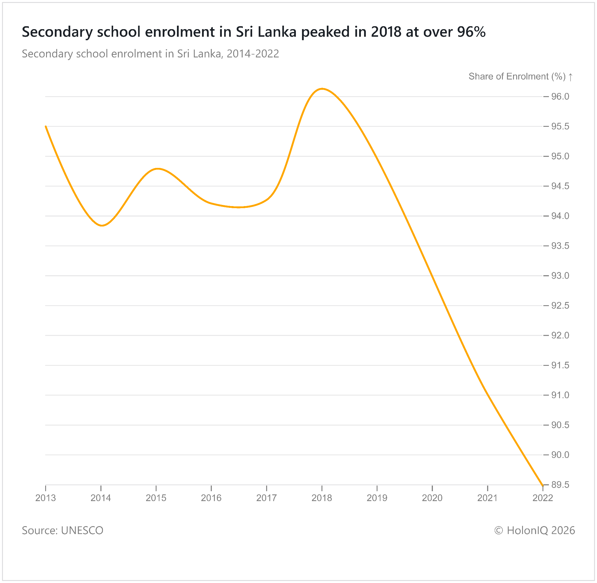 Secondary school enrolment in Sri Lanka peaked in 2018. The trend reflects strong historical access prioritising free education. This policy has supported high enrolment and contributed to one of the highest literacy rates in the region. Broad access to schooling has strengthened human capital and social mobility over time. The Free Education Policy implemented by the Government of Sri Lanka ensures universal access to education.