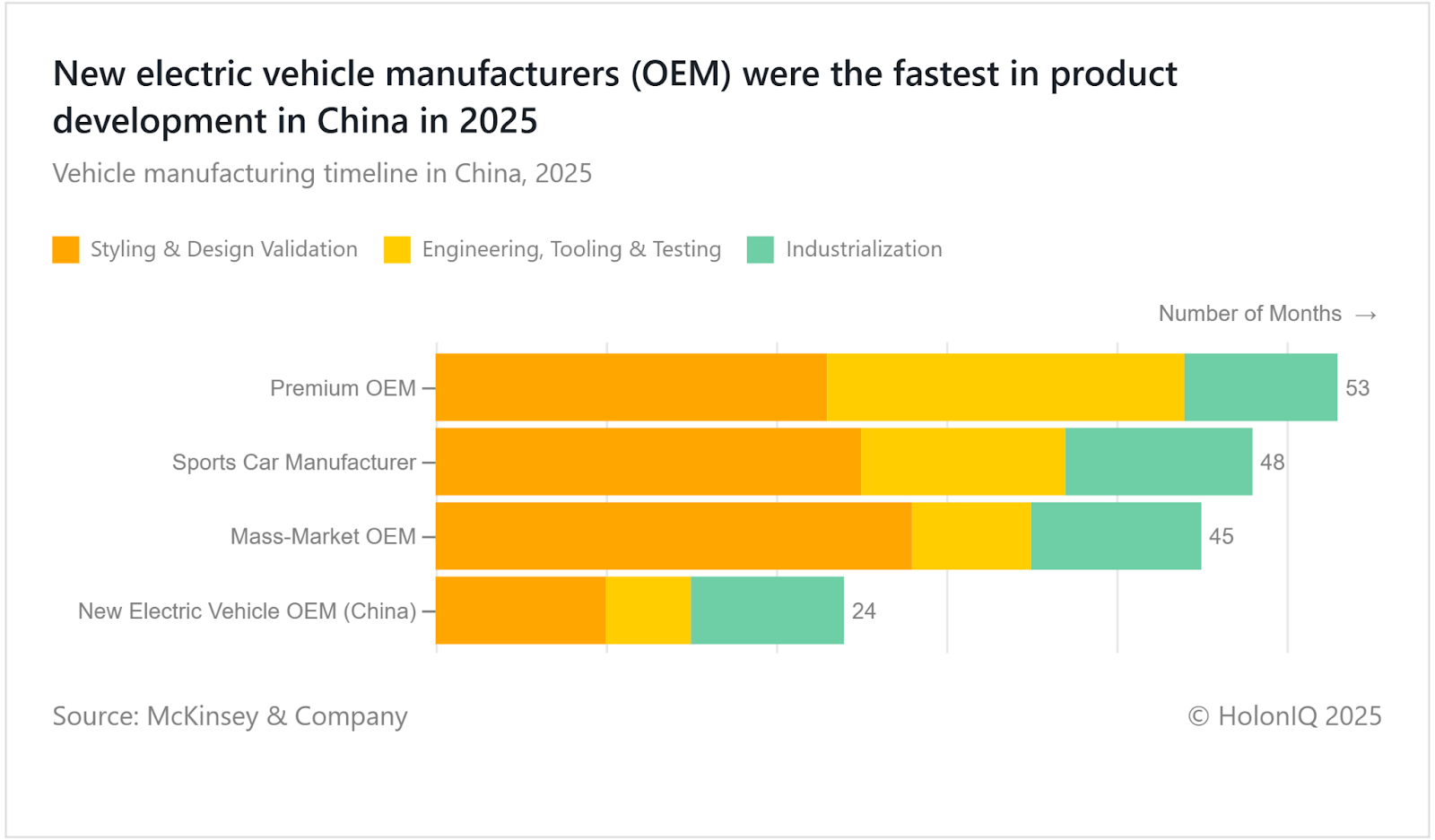 China’s new EV OEMs (Original Equipment Manufacturers) bring models to market in roughly 24 months, about half the time of mass-market or premium peers, by simplifying platforms, leveraging modular designs and digital engineering, and integrating software early in the development process. They are also achieving economies of scale owing to growing domestic and international demand. They uphold standards using modular components and local certification frameworks, such as CQC quality marks, while conducting rigorous supplier audits to ensure consistency. However, rapid cycles risk increased recall exposure and intense price competition, while changing regulations could strain long-term viability.