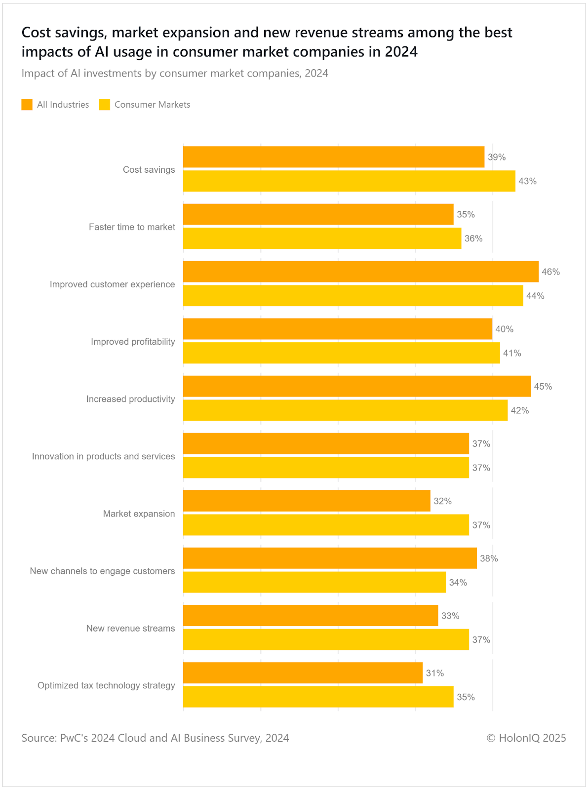 Consumer market companies leveraged AI in 2024 to uncover new market opportunities and scale operations efficiently, achieving cost savings while innovating products and services. AI has been key in new targeted marketing strategies aimed at niche audiences, backed by data-driven insights and trend analysis. AI enabled faster time to market and market expansion, creating new revenue streams by analysing customer data and automating operational workflows. These efficiencies allow businesses to pursue unique opportunities while maintaining lower costs and higher profitability.