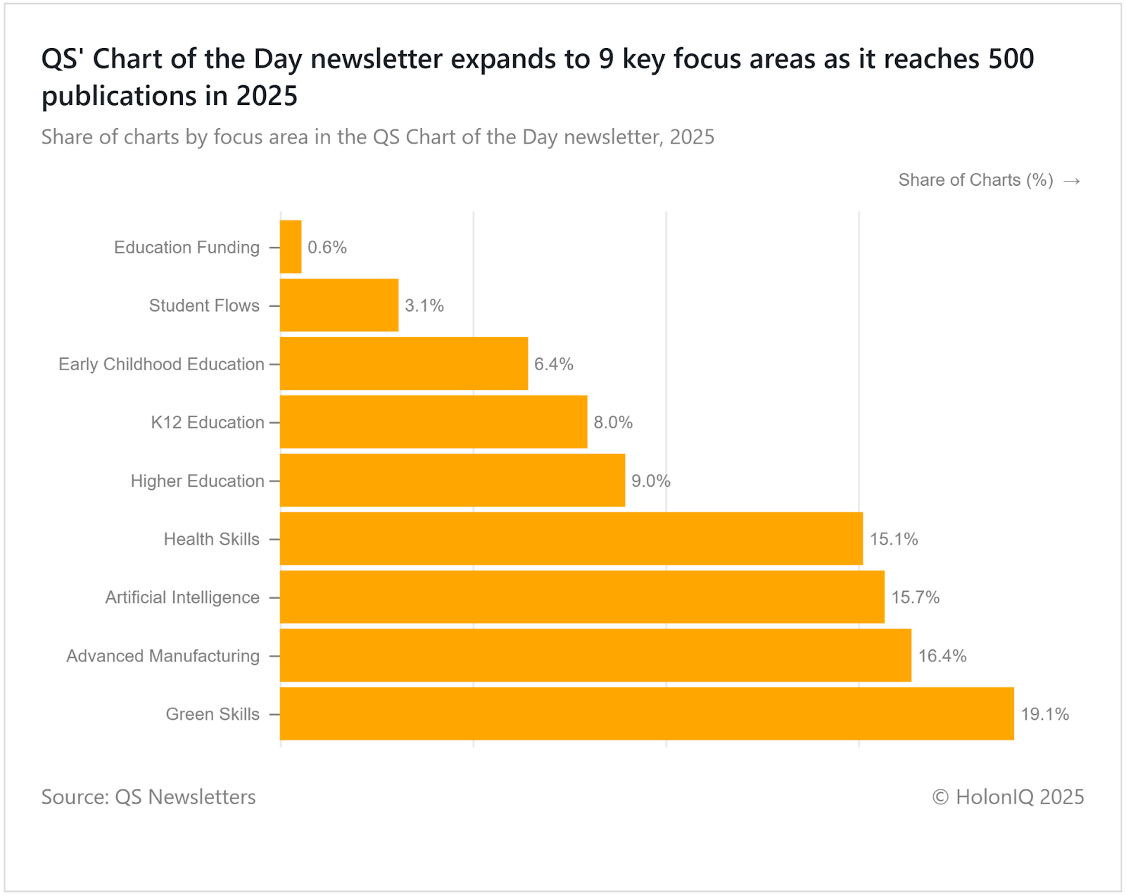 QS' Chart of the Day marks its 500th publication milestone today, a testament to evolving reader demand for data-driven insights. Launched with three core focus areas, namely education, climate, and industrial sectors, including healthcare, space and defence, and economics, the newsletter has now expanded to nine specialised domains. Education coverage spans early childhood through higher education, with the latest focus on student flows and education funding. Impact sectors encompass green skills, health skills, AI, and advanced manufacturing. As the newsletter reaches this significant benchmark, it remains committed to delivering curated charts and actionable intelligence that empower readers to stay informed on the industries shaping tomorrow's world.