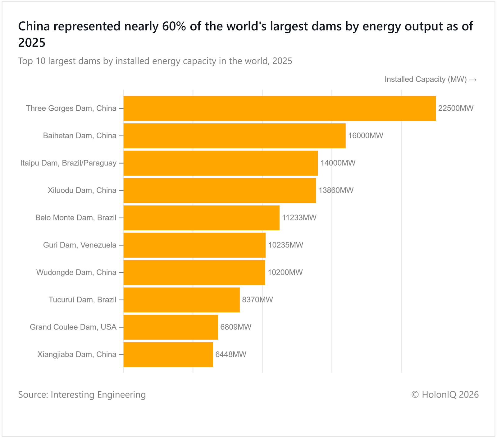 China accounted for nearly 60% of the world’s largest dams by installed capacity, reflecting decades of state-led investment in hydropower and grid-scale energy security. Large river basins and centralised planning have allowed projects to be built at unmatched scale. In South America, major dams operate under rising water scarcity as droughts and competing agricultural demand reduce reliability. China’s Renewable Energy Law continues to prioritise hydropower expansion, while South American governments increasingly rely on integrated water resource management policies to balance energy and water use.