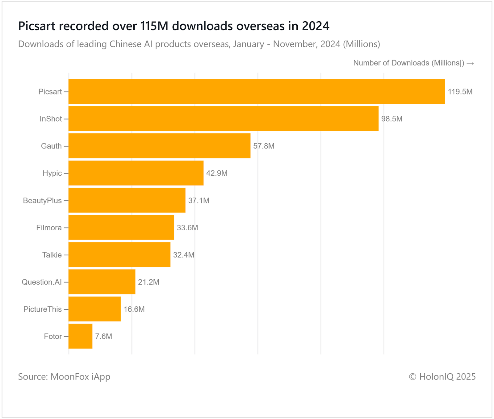 In 2024, Chinese AI apps gained massive global traction, moving outside of strong domestic markets, with Picsart exceeding 115 M downloads and others like InShot and Gauth also performing strongly. Many offer premium features for free or at low cost, boosting accessibility and user adoption. The specialised camera effects and image-editing segment is rapidly expanding, alongside short-form content platforms such as TikTok, with Chinese AI apps combining cross-platform compatibility, advanced filters, and AI-powered enhancements to capture a growing global market.