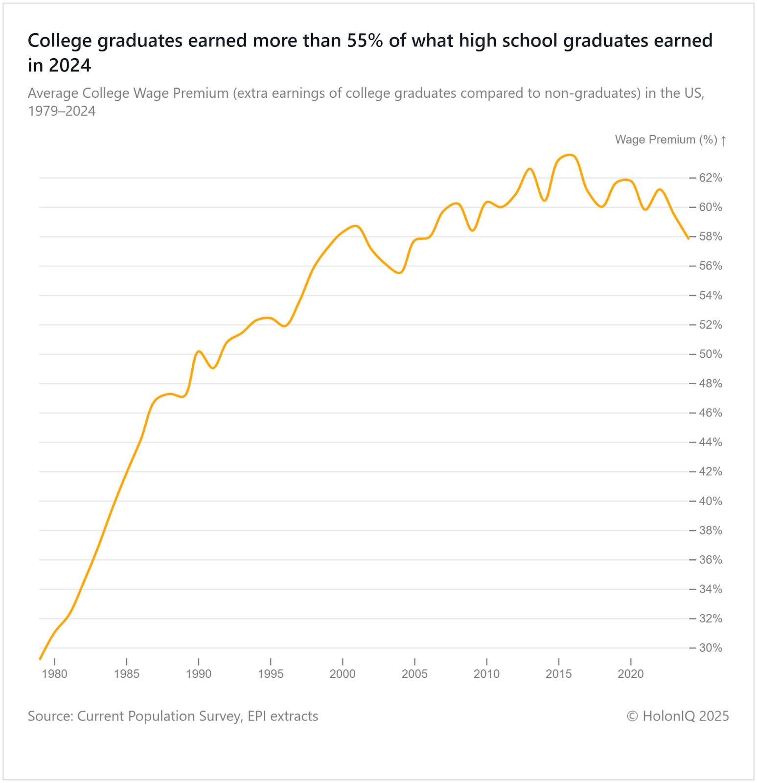 By 2024, US college graduates earned over 50% wage premium over high-school graduates, underscoring the enduring earnings advantage of tertiary education. However, degree value is fragmenting as bachelor’s credentials become a baseline rather than a differentiator. However, even companies such as Google announced how a degree is not a prerequisite for employment. There is also a rising trend of teenagers increasingly bypass college for early ventures and entrepreneurship and skill based jobs, while online certifications and micro-credentials gain traction for job-ready skills, reshaping how human capital is valued in a digital economy.