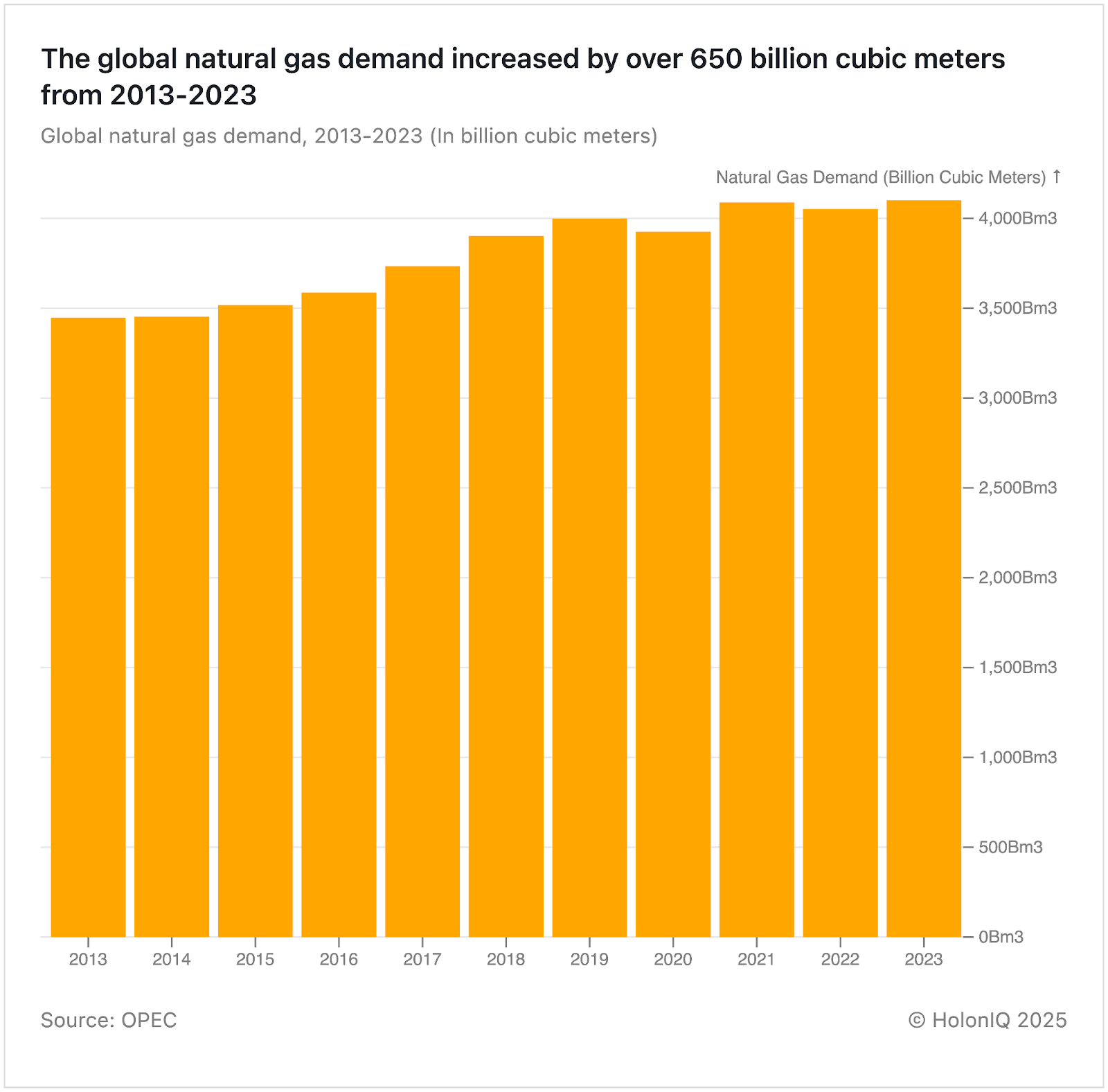 Global natural gas demand rose from 2013 to 2023, reflecting steady consumption despite post-pandemic volatility and energy diversification efforts. Growth remains driven by industrial and power generation use, particularly in Asia, even as renewables gain ground. The data highlight gas’s transitional role in balancing grids during the global energy shift. The IEA’s Net Zero Roadmap continues to emphasize a gradual phase-down through efficiency and low carbon alternatives.