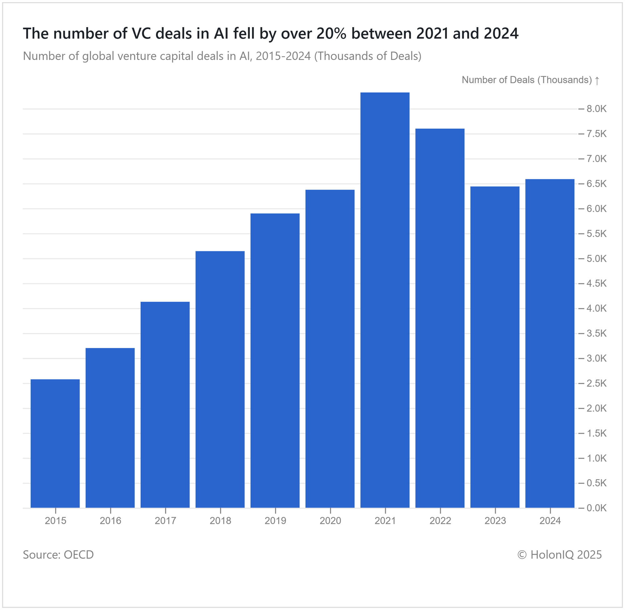 Global VC deals in AI peaked at over 8K in 2021 but dropped by 20% to just over 6K by 2024. In response, various governments introduced initiatives to support the sector. The US launched Executive Order 14179 to remove barriers and boost unbiased AI development, alongside the $500B Stargate Project for AI infrastructure. India expanded its Fund of Funds for Startups and extended Section 80-IAC tax benefits in 2025, fostering AI startups and deep-tech ventures despite market fluctuations.