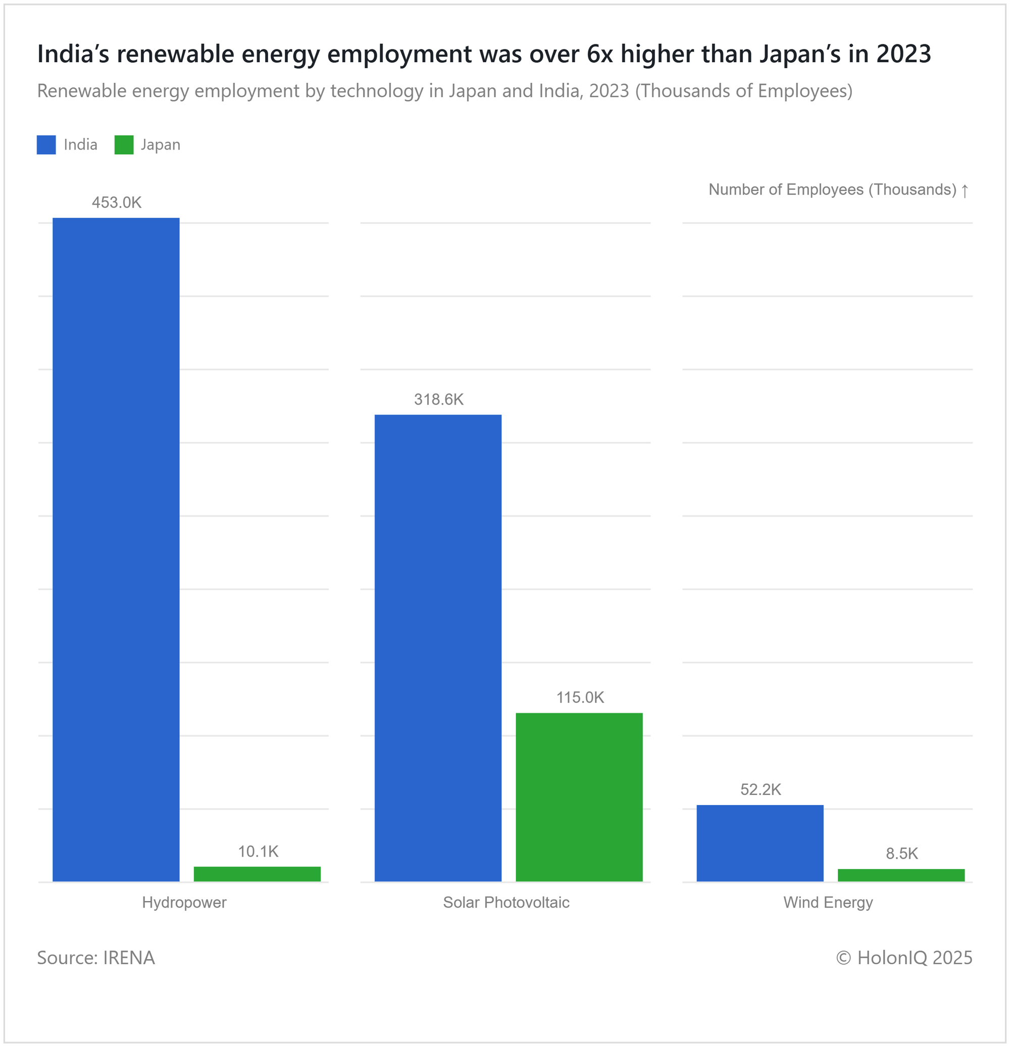 In 2023, India employed over 800K workers in the hydropower, solar PV, and wind energy sectors, which is more than six times Japan’s renewable energy employment. This growth supports India’s 2030 target of 500 GW, driven by key policies like the National Green Hydrogen Mission, which promotes green hydrogen production. Japan is also expanding its renewable workforce through the 6th Strategic Energy Plan and the GX Decarbonization Power Supply Bill, aimed at boosting energy capacity and employment.