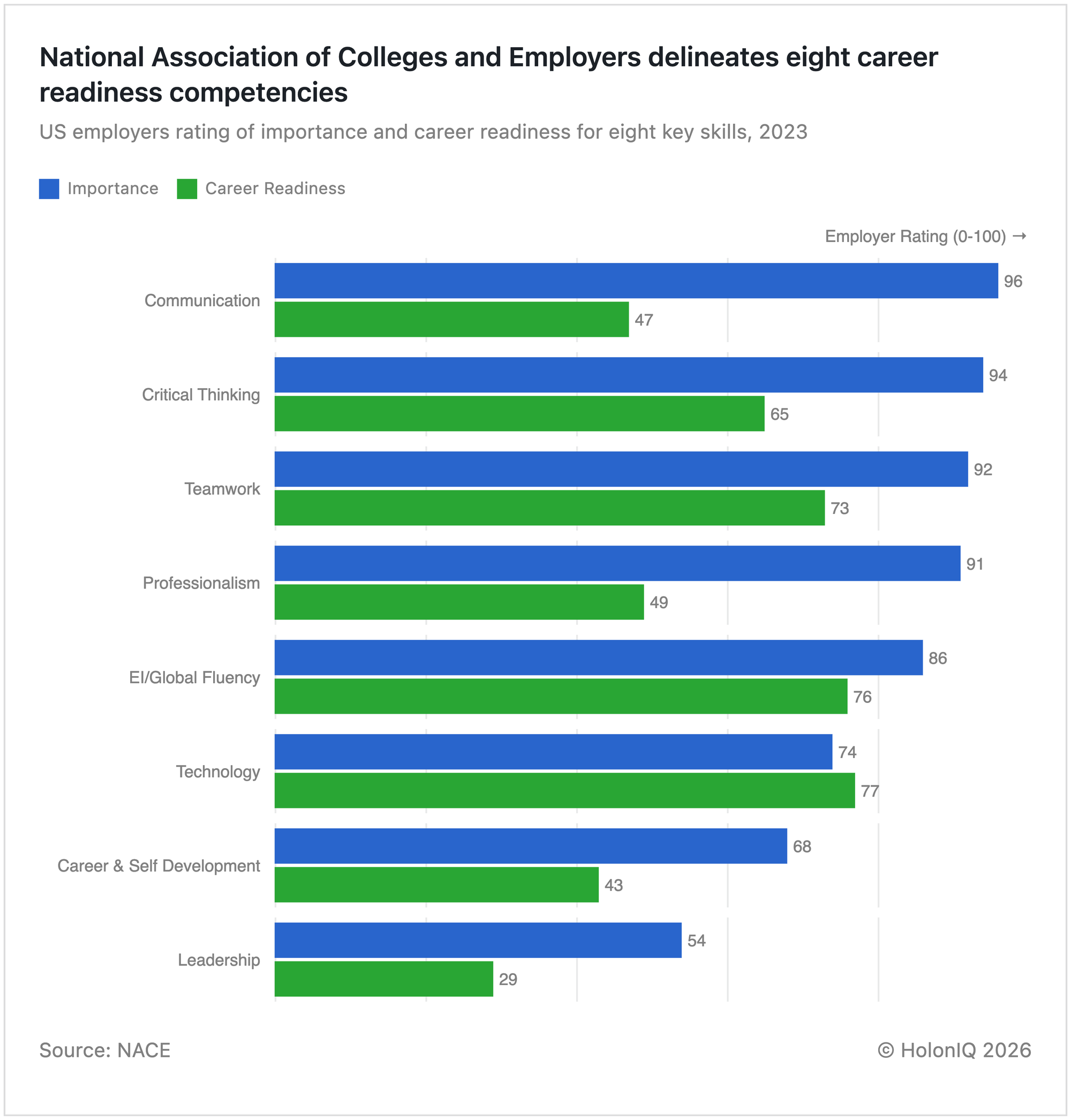 US employers value communication and critical thinking most, but the gap between importance and career readiness is widest in the skills that matter most.