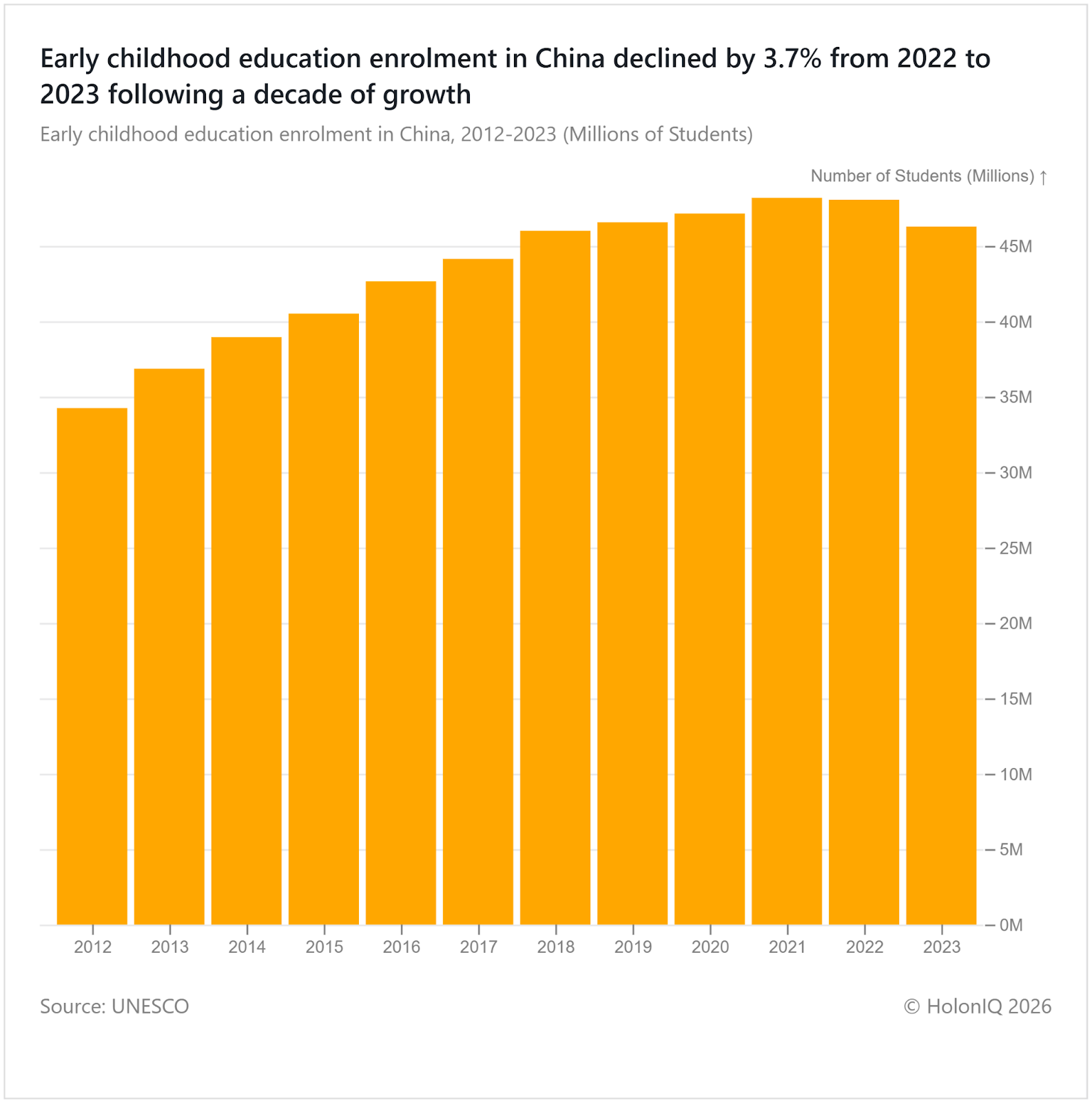 Early childhood education enrolment in China dropped by 3.7% in 2023 to 46.3M, reflecting demographic shifts following a decade of growth as China experiences a fall in birth rates. Thousands of kindergartens were reportedly closed due to lower demand. In response, policies aim to transform excess kindergartens into childcare centres for children under three. A tax exemption for parents with young children was also introduced to ease financial burdens and support long-term population goals.