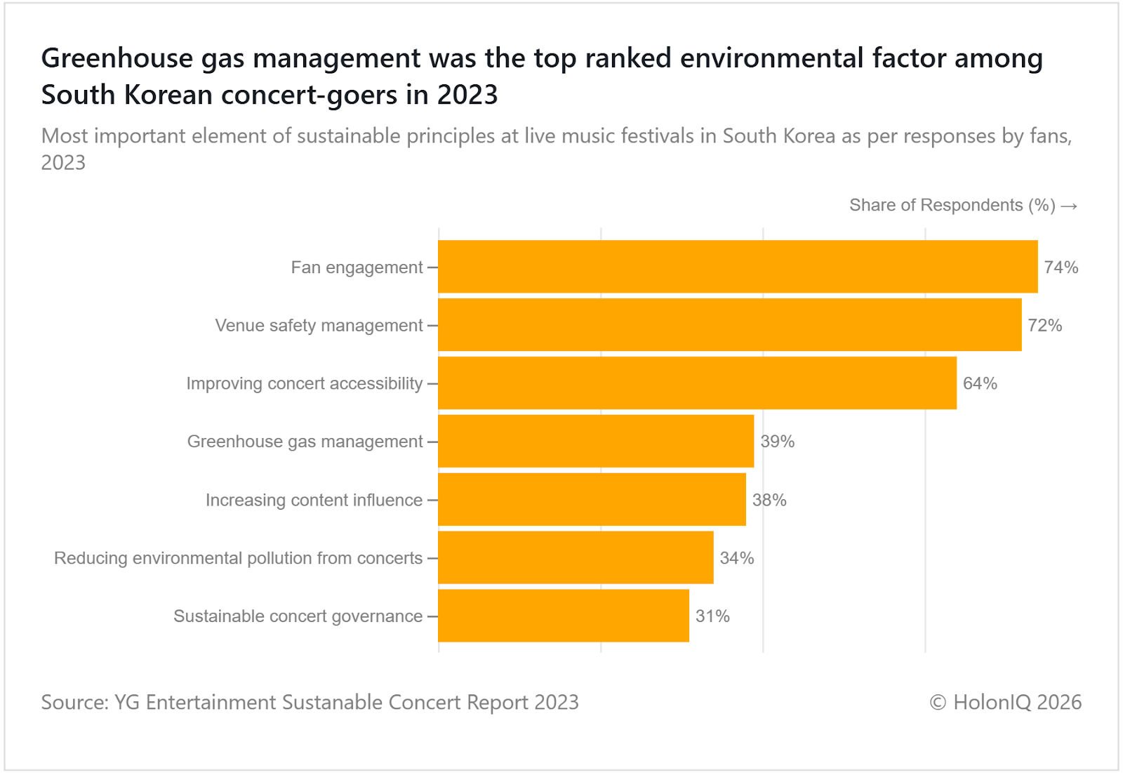 Global concerts generate up to 5M tonnes of COโ annually, with transportation accounting for the majority of emissions. In South Korea, greenhouse gas management ranks fourth among concert fan priorities after engagement, venue safety, and accessibility. Major K-pop agencies are now pursuing ESG goals to minimise their environmental impact. Major global initiatives include artists like Coldplay pledging emission cuts, solar-battery systems, Glastonbury's fossil-free energy programme, and zero-plastic policies at concerts.