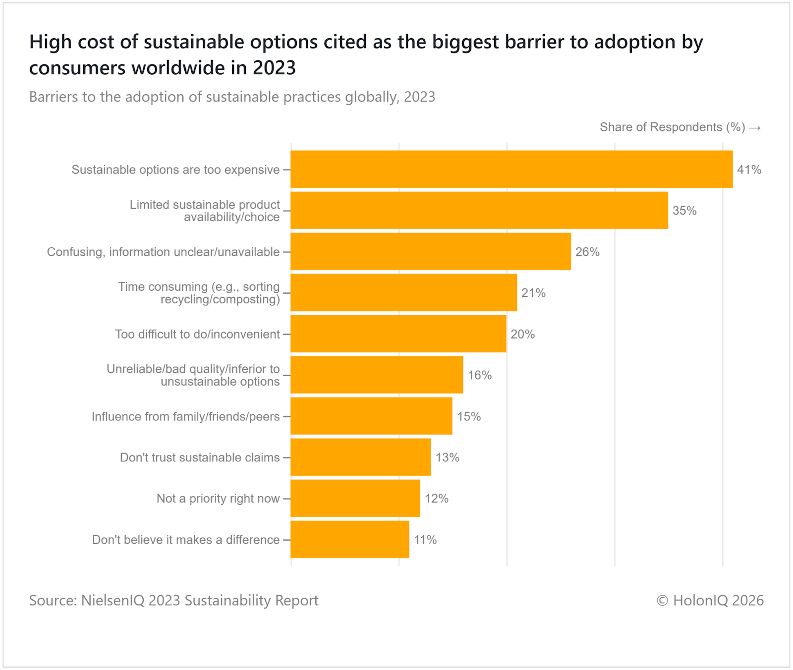 High cost was cited as the biggest barrier to sustainable adoption in 2023, with eco-products costing 75-85% more due to expensive raw materials, small-scale production, renewable energy use, and certification costs. However, improvements emerged as economies of scale expanded and direct-from-source supply chains reduced markups. Despite progress, consumers prioritise price over sustainability when eco-products cost more, while 70% remain sceptical of corporate claims fueled by greenwashing concerns. Greenwashing is also a common issue, as many eco-friendly claims are "unsubstantiated", eroding trust across industries, highlighting persistent scepticism despite growing awareness.