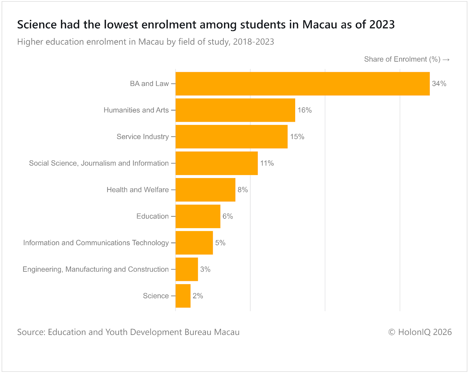 In Macau, science accounts for just 2% of higher education enrolment between 2018 and 2023. The pattern reflects the region’s service oriented economy built around tourism, hospitality, and finance. Students often choose degrees aligned with local job markets such as business, service industries, and communications. Limited domestic research infrastructure also contributes to lower science participation. The Higher Education Development Plan implemented by the Government of Macau aims to diversify academic fields and expand research capacity.