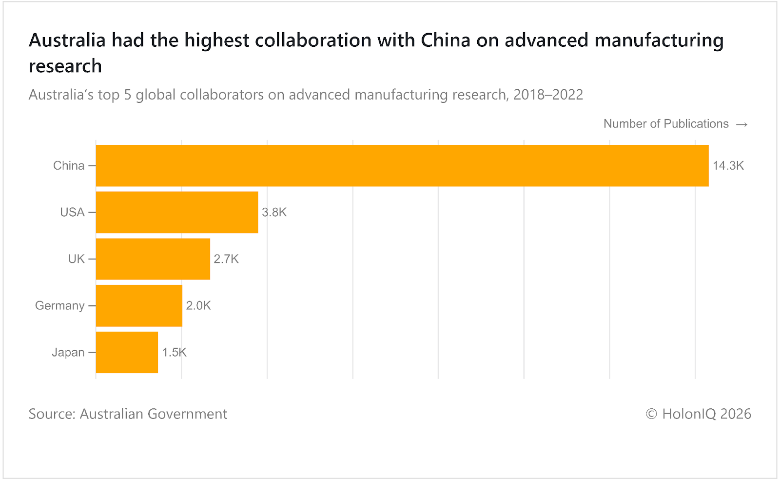 China accounted for over 14K collaborations with Australia in advanced manufacturing research between 2018 and 2022. China’s large research base, manufacturing scale, and materials science expertise attract joint projects with Australian universities and labs. Collaboration often focuses on advanced materials and production technologies. Australia’s National Reconstruction Fund, administered by the Australian Government, supports expanding advanced manufacturing partnerships.