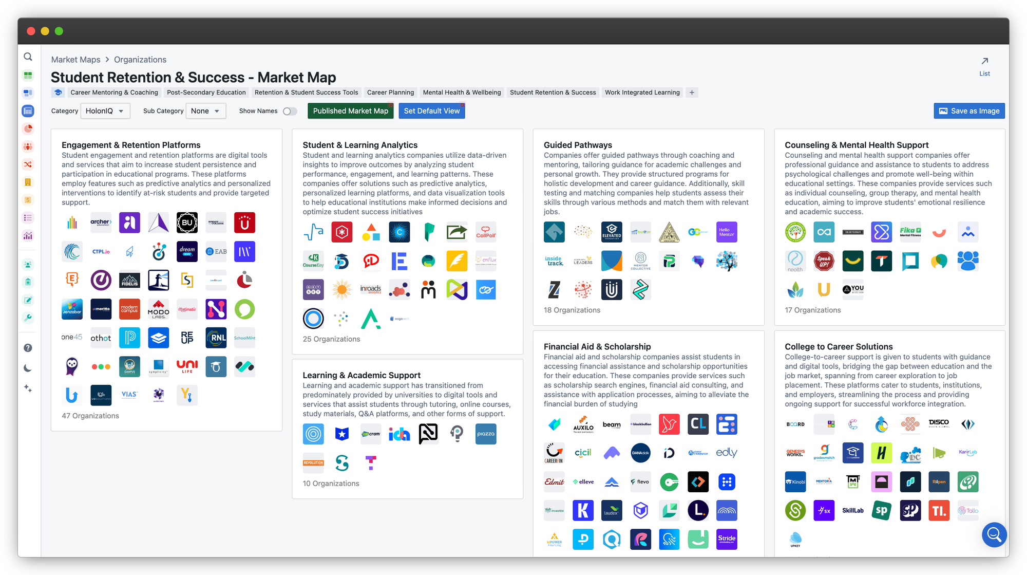 HolonIQ's market maps segments the solutions operating in the student health and wellness category and provides real-time information on this and hundreds of other markets. To learn more, customers can check out the list of organizations on our platform. If youโd like a demo, click here!