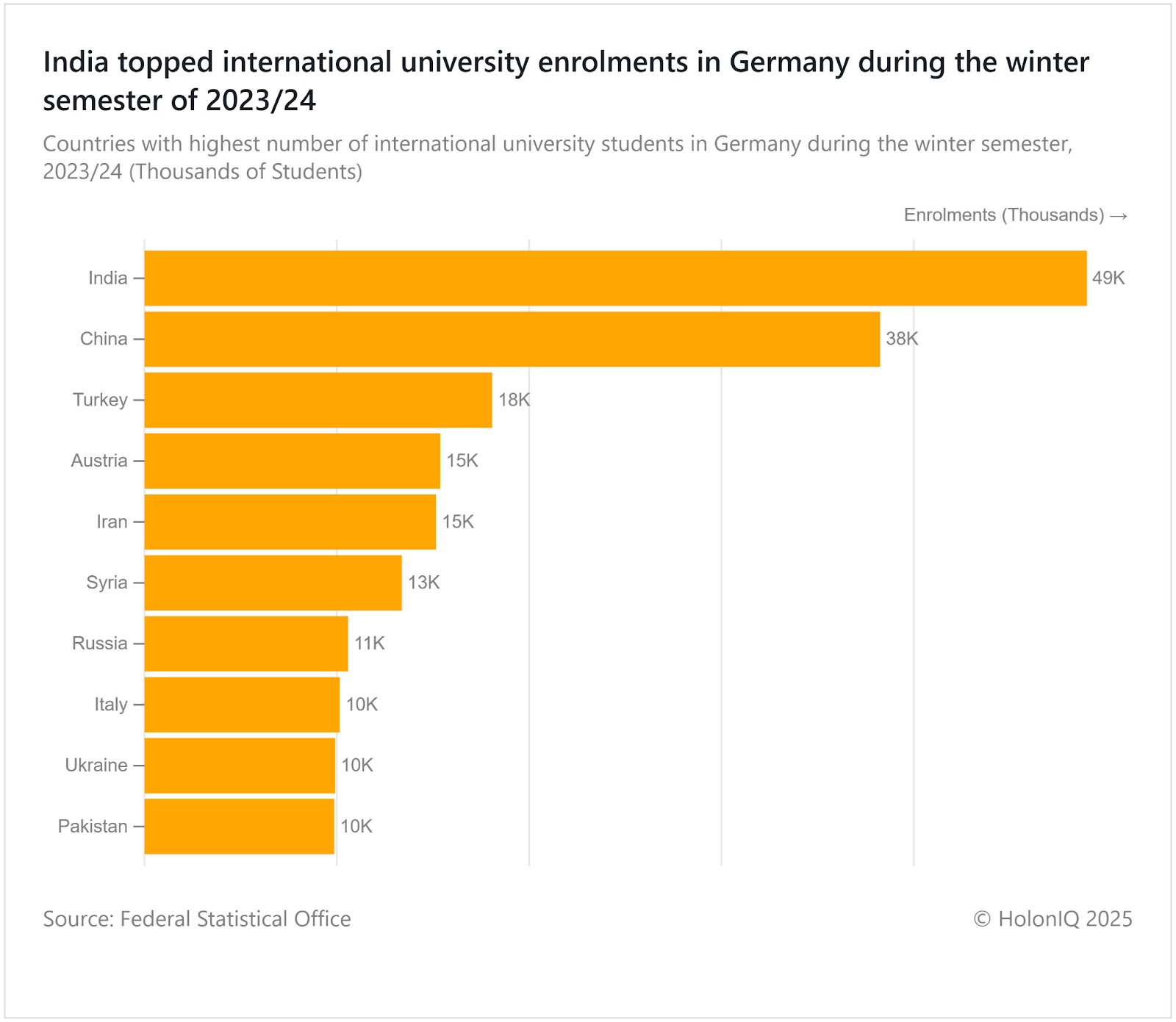 India topped international university enrolments in Germany with nearly 50K students in 2023/24, as Indian students shift from the UK to European destinations. Benefits include tuition-free public universities, 20-40% lower living costs than in the US and UK, two-year post-study work permits, and 200+ English-taught programs. High-level partnerships include GIANT (German Indian Academic Network for Tomorrow), launched in October 2024 is a bilateral program funding mobility, research, and joint teaching. The India-Germany Mobility Partnership helps streamline visas for students. Germany's structured education, strong engineering focus, and clear pathways to permanent residency make it a strategic alternative for Indian students.