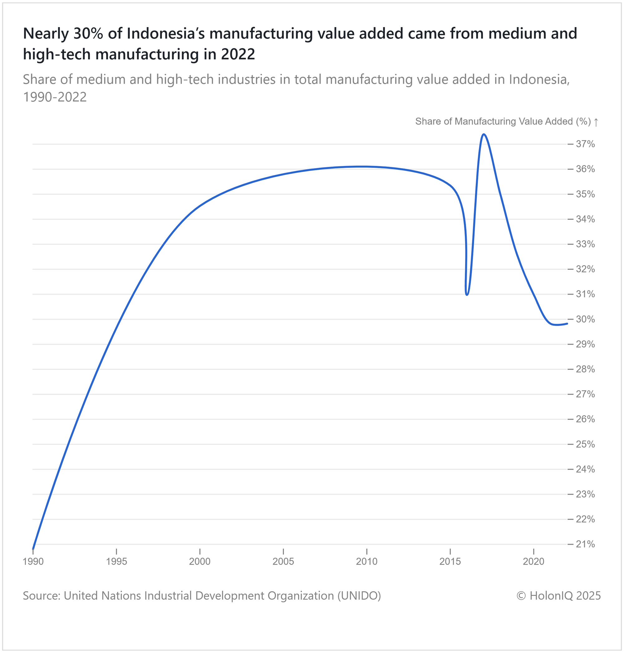 In 2022, Indonesia’s medium and high-tech manufacturing value-added dropped below 30%, down from a 2017 peak of nearly 40%. To reverse this trend, the government promotes technological advancement through the Digital Indonesia Roadmap 2021-2024, enhancing digital infrastructure and skills, and the Masterplan for Acceleration and Expansion of Indonesia’s Economic Development (MP3EI), which boosts industrial competitiveness and investment in high-tech sectors. These policies aim to strengthen Indonesia’s tech-driven manufacturing and economic growth.