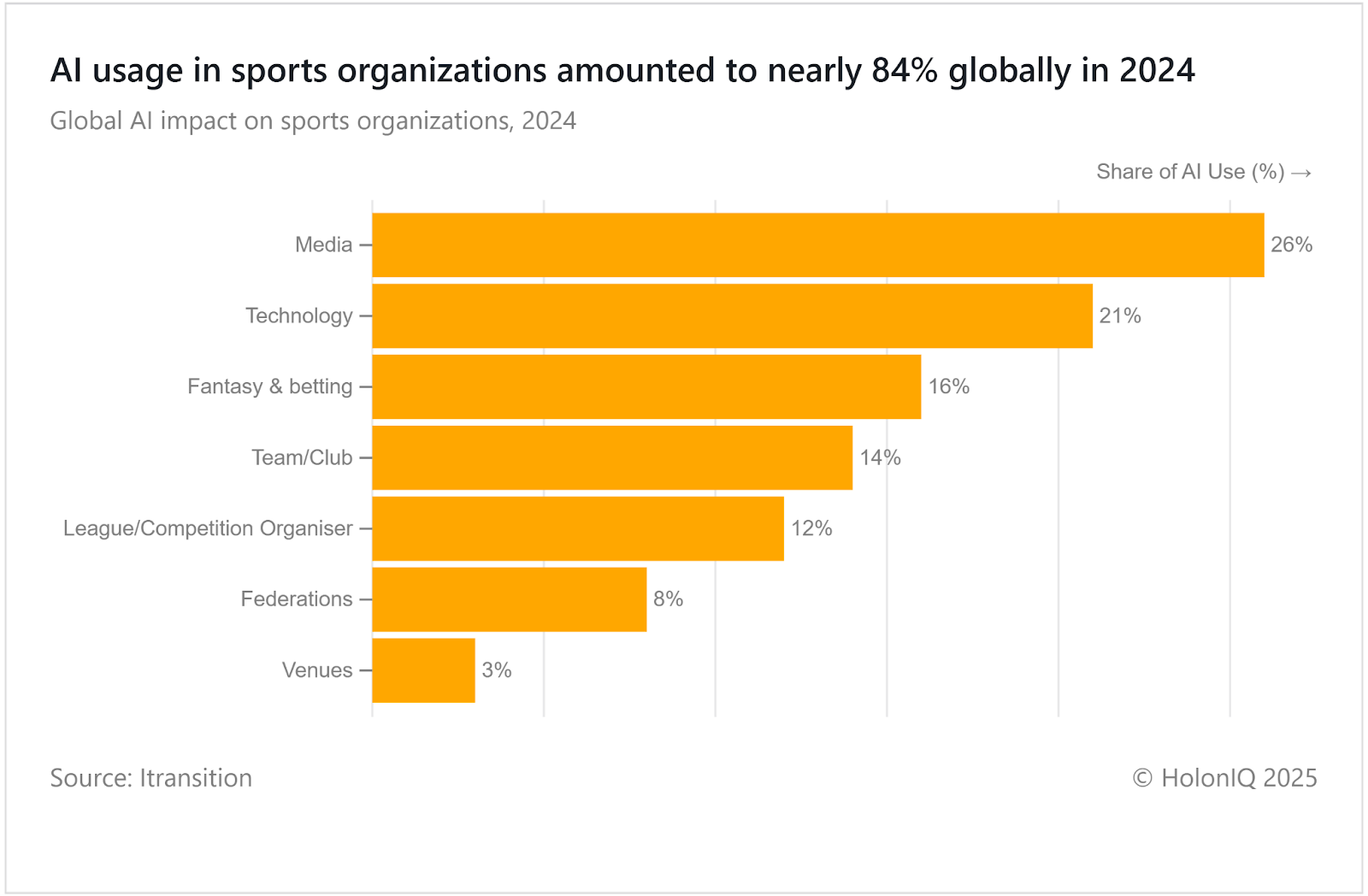 In 2024, media companies accounted for 26% of AI impact in sports. Teams, leagues, and federations are also increasingly leveraging AI to improve performance, operations, and fan engagement. From predictive analytics to immersive viewing, the technology is transforming the sports ecosystem. FIFA’s AI in Football program highlights how governing bodies are adopting innovation to shape the future of the game.