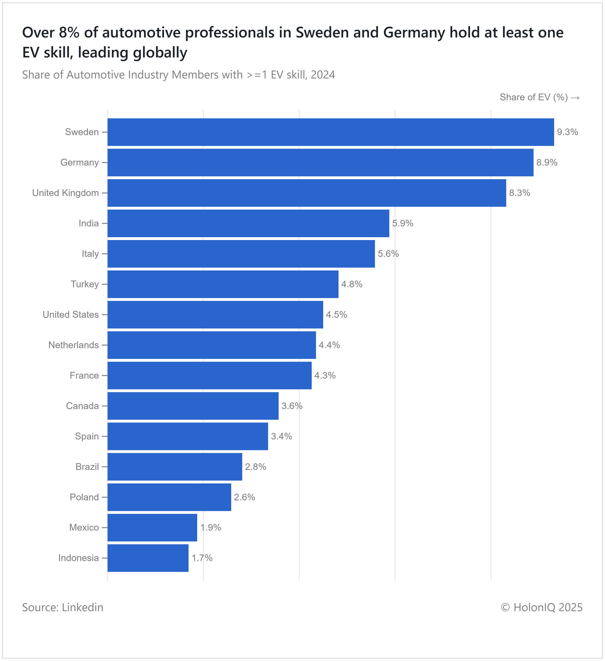⚡ The UK and US maintain moderate EV skill shares of 8.3% and 4.5%, reflecting steady growth supported by expanding EV markets and infrastructure investments, though still trailing leaders Sweden and Germany.