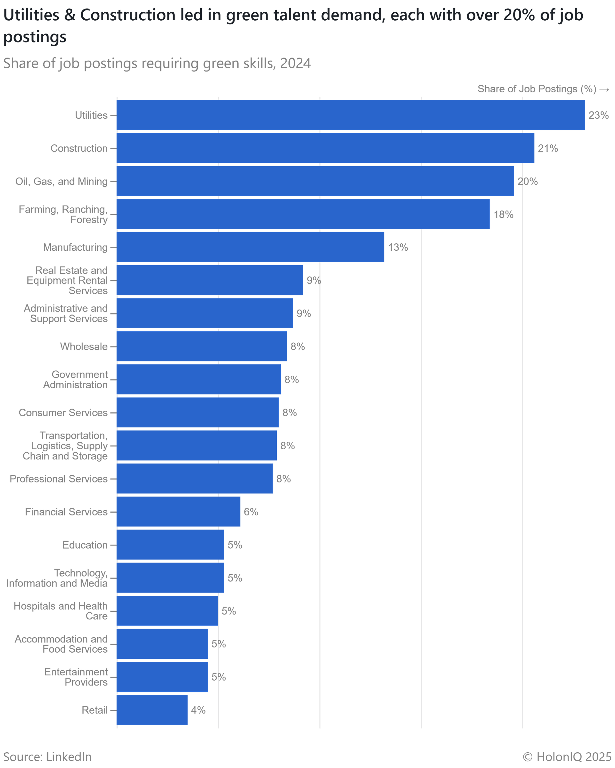 In the green workforce landscape, the global shift towards sustainability is driving a surge in demand for green expertise, outpacing workforce supply. In 2024, global demand for green skills grew by 11.6%, while supply lagged at 5.6%, with the gap projected to widen to 101.5% by 2050. As visualized below, utilities (23.1%) and construction (20.6%) lead in green job demand, underscoring the urgent need for skilled workers in energy and infrastructure. This also partly stems from the increase in construction activity as countries ramp up infrastructure spending to boost economic growth. To bridge this gap, India is investing $1.6B to upskill 6.6 million workers in green sectors. Meanwhile, Karnatakaโs Clean Mobility Policy aims to generate 100,000 jobs by advancing EV adoption and battery manufacturing, accelerating the transition to a sustainable economy.